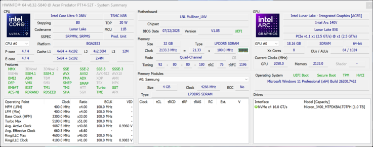 A bateria de 76 Wh permite tempos de funcionamento razoáveis, mas o processador Lunar Lake não oferece realmente uma vantagem aqui. Com 9 horas no teste WLAN a 150 cd/m² e 6:45 horas com brilho total, o Acer está um pouco à frente do Razer Blade 14 (72 Wh), mas também claramente atrás do ROG Zephyrus G14 (73 Wh).