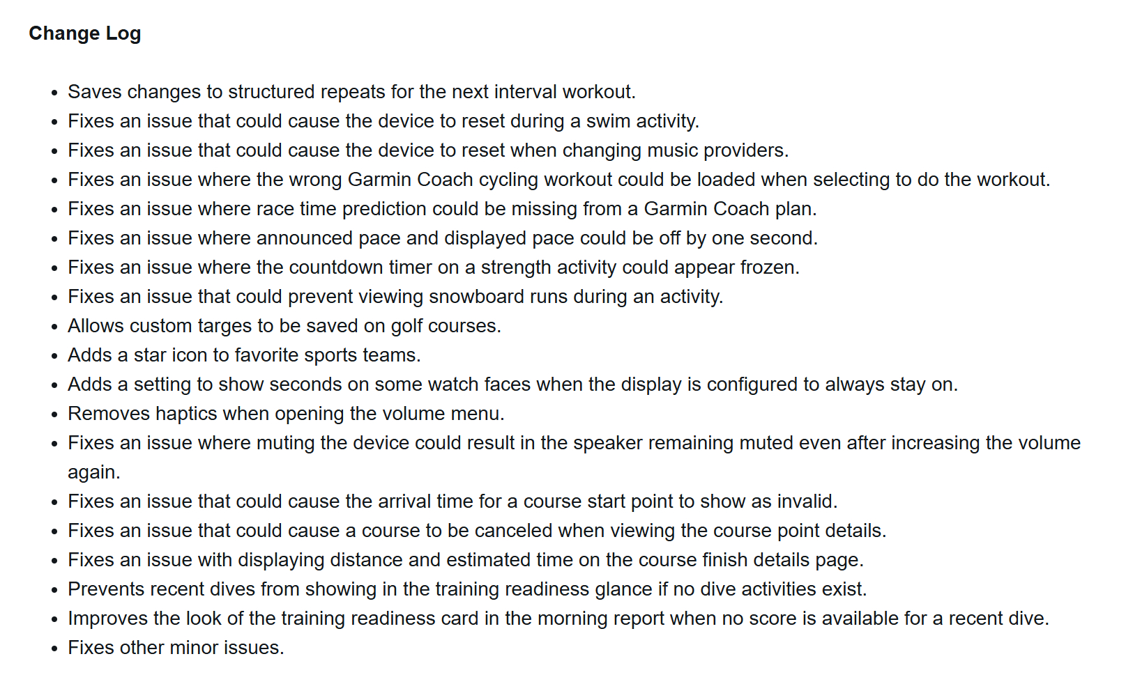 Os usuários do Forerunner 570 e do Forerunner 970 devem observar que o feedback tátil que ocorria quando o usuário abria o menu de volume foi removido. A Garmin não explicou por que tomou essa decisão. A empresa resolveu alguns bugs que poderiam fazer com que esses smartwatches fossem reiniciados, relacionados a atividades de natação ou à troca de provedores de música. Também foram resolvidos alguns problemas relacionados ao Garmin Coach, um problema com o cronômetro de contagem regressiva em uma atividade de força e um bug que impedia que o volume fosse aumentado depois de ter sido silenciado.