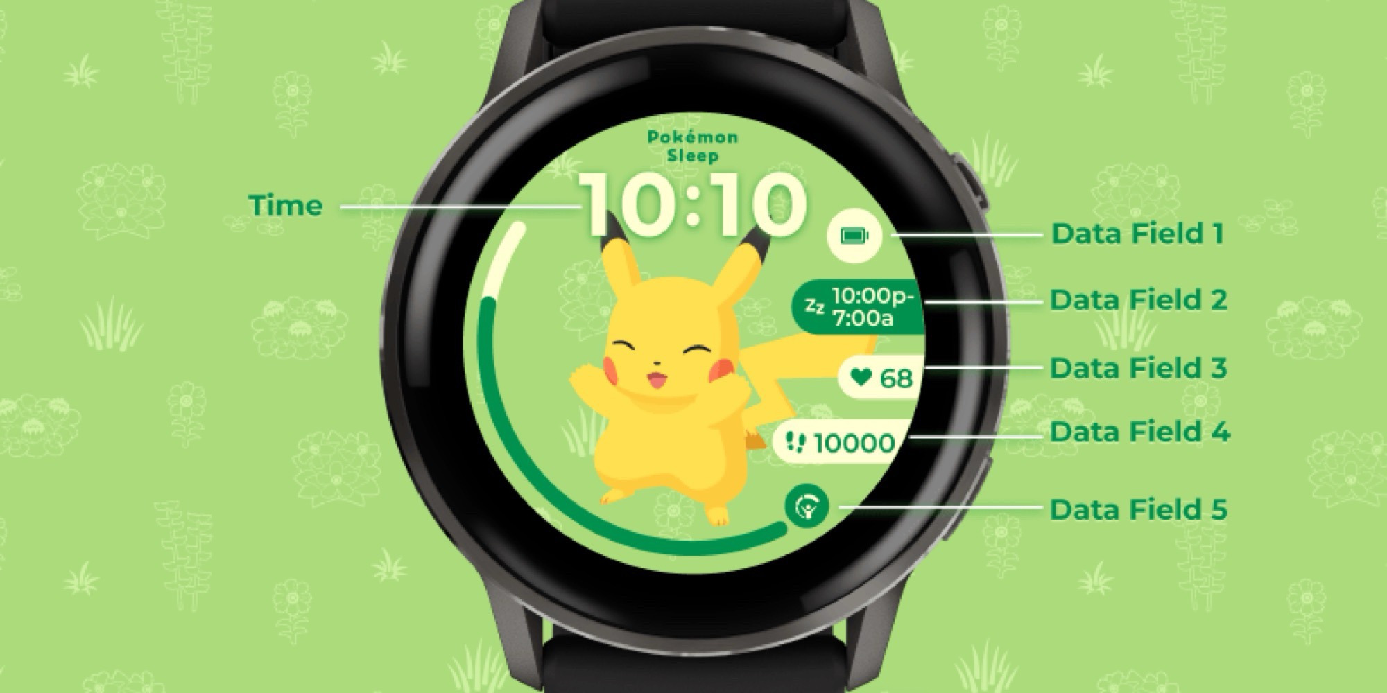 Além da data e da hora, o mostrador do relógio também oferece espaço para três complicações redondas que podem ser selecionadas livremente para exibir, por exemplo, os passos dados, a frequência cardíaca ou os detalhes do rastreamento do sono diretamente no mostrador do relógio. O segundo mostrador do relógio, chamado Pokémon Sleep: I Choose You, permite que os usuários escolham entre um total de 48 Pokémon diferentes. Esse mostrador do relógio também adapta a pose do Pokémon à bateria do corpo, mas o mostrador do relógio oferece espaço para cinco complicações.