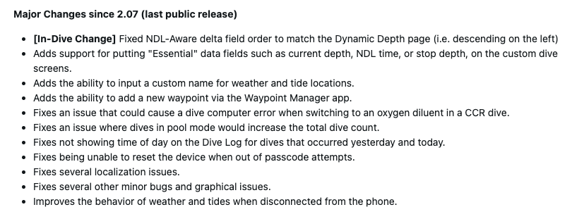 As notas de lançamento do software de sistema Garmin Descent X30 3.06 afirmam que ele permite que os usuários adicionem campos de dados essenciais, como profundidade atual, tempo NDL e profundidade de parada, à tela de mergulho personalizada. Há duas alterações relacionadas às informações sobre clima e maré. Em primeiro lugar, agora o senhor pode adicionar um nome personalizado para esses locais. Em segundo lugar, o comportamento dessas funções quando o wearable não está conectado ao telefone foi aprimorado.