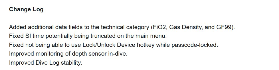 A versão 2.07 do software do sistema traz novos campos de dados técnicos para o Descent X30. São eles a Fração de oxigênio inspirado (FiO2), a Densidade de gás e o GF99. Em um post no Fórum da Garmina empresa indica que melhorou o monitoramento de profundidade durante o mergulho por meio do sensor do dispositivo. Além disso, diz-se que a estabilidade do registro de mergulho dos computadores de mergulho foi otimizada.