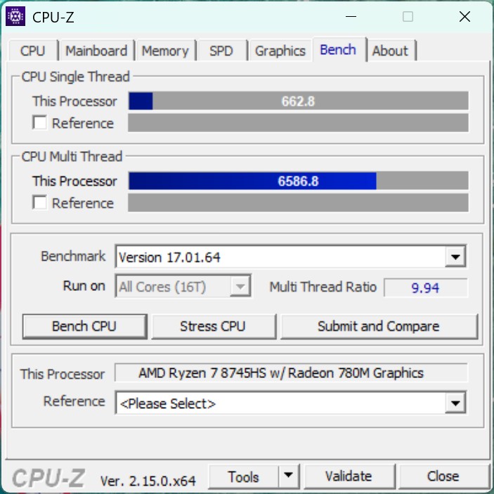 O Geekom A8 com AMD Ryzen 7 8745HS (Zen 4, 8 núcleos) pode atingir um consumo de energia de curto prazo de até 60 watts, mas diminui para cerca de 35 watts sob carga total contínua. Isso é particularmente perceptível em benchmarks de vários núcleos, como o teste de resistência Cinebench R15, enquanto o desempenho de um único núcleo está em um bom nível em comparação. Em comparação com o Geekom A8 com AMD Ryzen 9 8945HS, o dispositivo de baixo desempenho está apenas um pouco atrás.