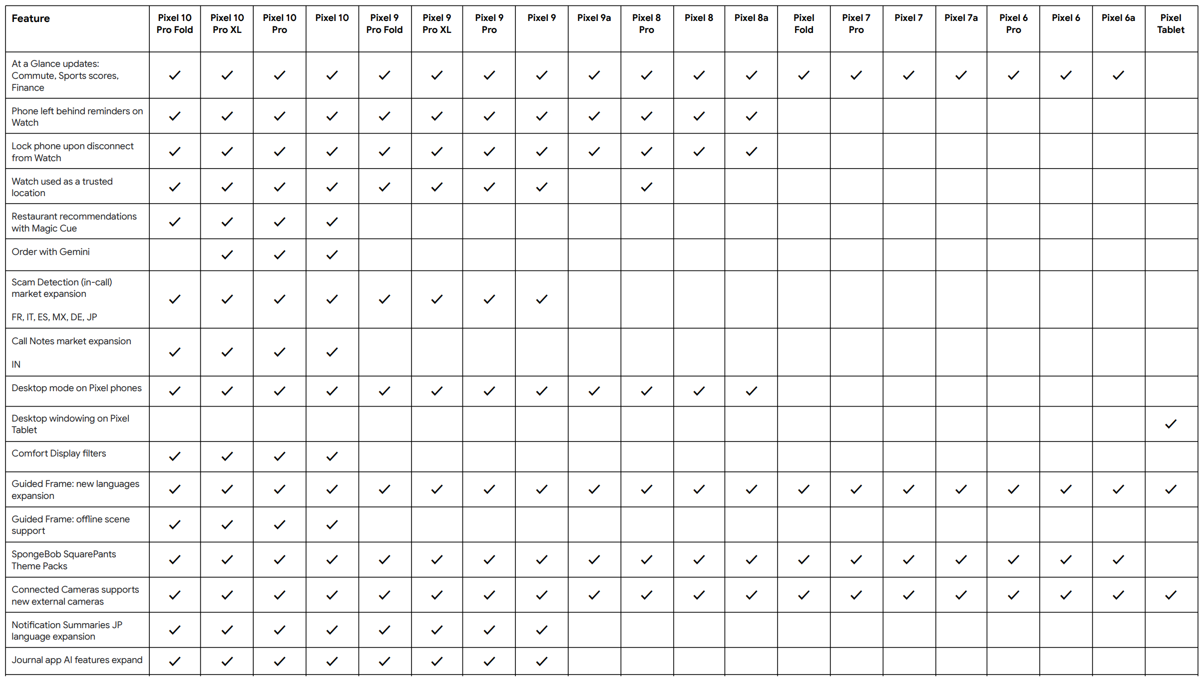 A propósito, o janelamento da área de trabalho também chegou ao Pixel Tablet. Além disso, o Google expandiu a detecção de fraudes durante as chamadas para a Alemanha, França, Itália, Japão, México e Espanha. Consulte a tabela abaixo para obter mais detalhes sobre quais novos recursos chegarão a quais dispositivos no final deste mês.
