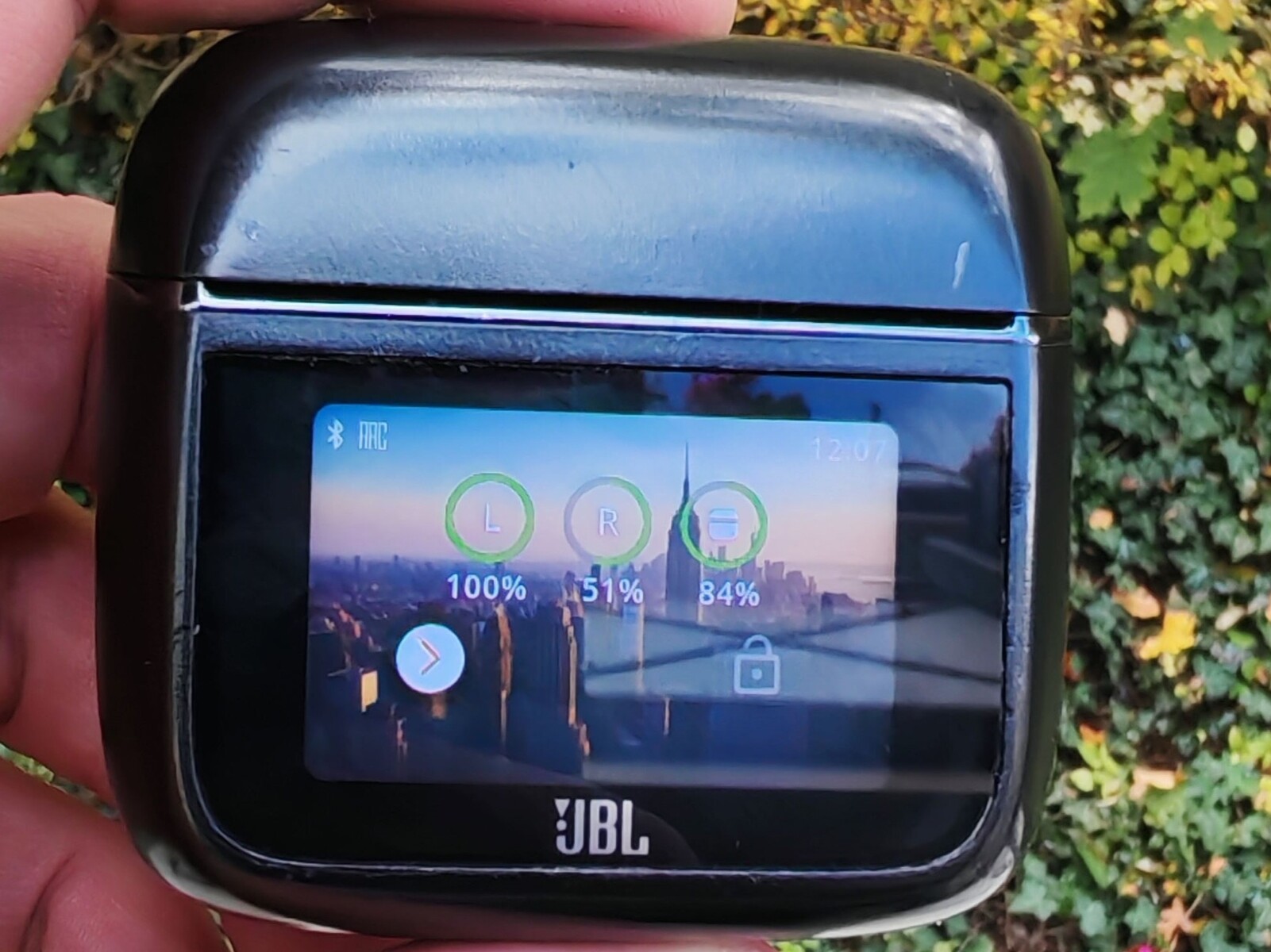 O que diferencia o JBL Tour Pro 3 de muitos outros fones de ouvido intra-auriculares é seu estojo de carregamento com uma tela sensível ao toque integrada. A tela não tem o brilho ou a nitidez de um painel AMOLED moderno, mas sua luminância relativamente baixa só limita a usabilidade em raras situações. Várias configurações podem ser ajustadas diretamente na tela - por exemplo, controles ANC e acesso rápido às predefinições do equalizador. Os usuários também podem definir temporizadores, escolher imagens de fundo e até mesmo acionar um som alto dos fones de ouvido para ajudar a localizá-los.