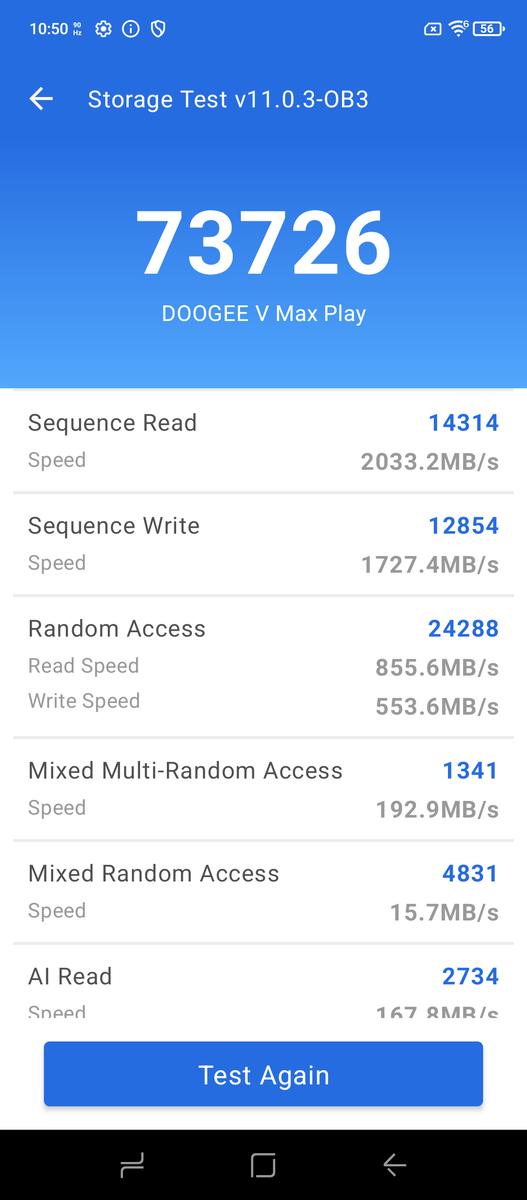 Seu chip de armazenamento de 512 GB é impressionantemente rápido, com leituras sequenciais de aproximadamente 2 GB/s. Os 16 GB de RAM e o SoC usado também são suficientes para a maioria das tarefas; o AnTuTu acredita que o V Max Play testado foi construído com base no Mediatek's Dimensity 7300X da Mediatekda Mediatek, que não é muito diferente do Dimensity 7300. Ambos apresentam 4 núcleos "grandes" e 4 "pequenos" com velocidades de clock moderadas.