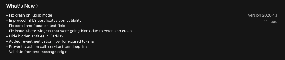 As notas de lançamento da versão 2026.4.1 do aplicativo Home Assistant para iOS informam que foi adicionado um fluxo de reautenticação para tokens expirados. As entidades vinculadas ao CarPlay agora podem ser ocultadas, e a compatibilidade dos certificados relacionados à nova função de autenticação Mutual Transport Layer Security (mTLS) foi aprimorada.