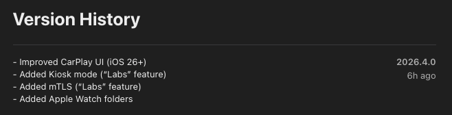 A versão 2026.4.0 do aplicativo Home Assistant também inclui três novos recursos. Um deles é o modo Kiosk, que parece estar vinculado à integração do navegador Fully Kiosk Browser. Outro é o Mutual Transport Layer Security (mTLS), uma forma de autenticação para segurança adicional. Ambos são recursos "Labs", o que significa que ainda estão em teste, embora não devam apresentar erros graves. Por fim, agora há suporte para pastas no aplicativo Apple Watch(Series 11 46 mm GPS curr. US$ 359 na Amazon).