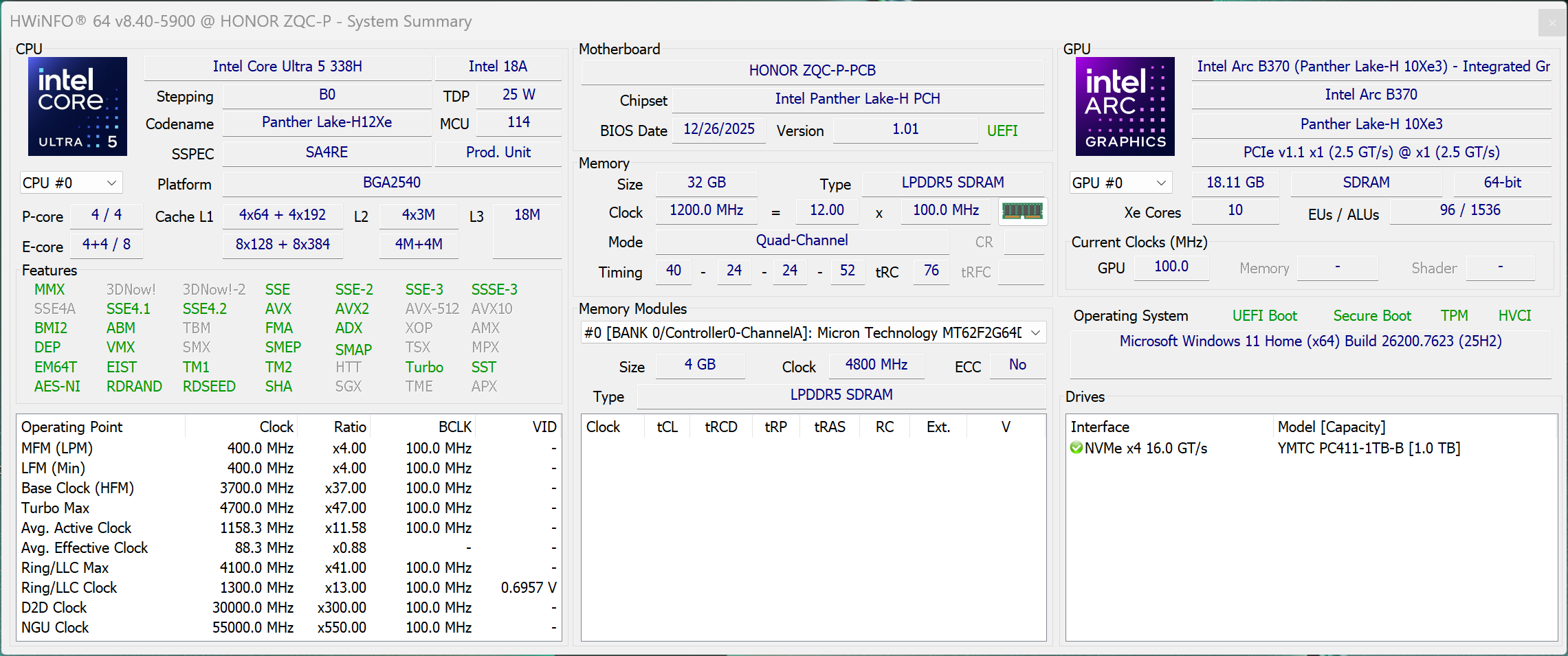 | Honor MagicBook Pro 14 2026 Intel Core Ultra 5 338H ⎘ Intel Arc B370 10 Xe3 Panther Lake iGPU ⎘ 32 GB Memória, 1024 GB SSD | 1.4 kg | 15.9 mm | 14.60" 3120x2080 257 PPI OLED | ||