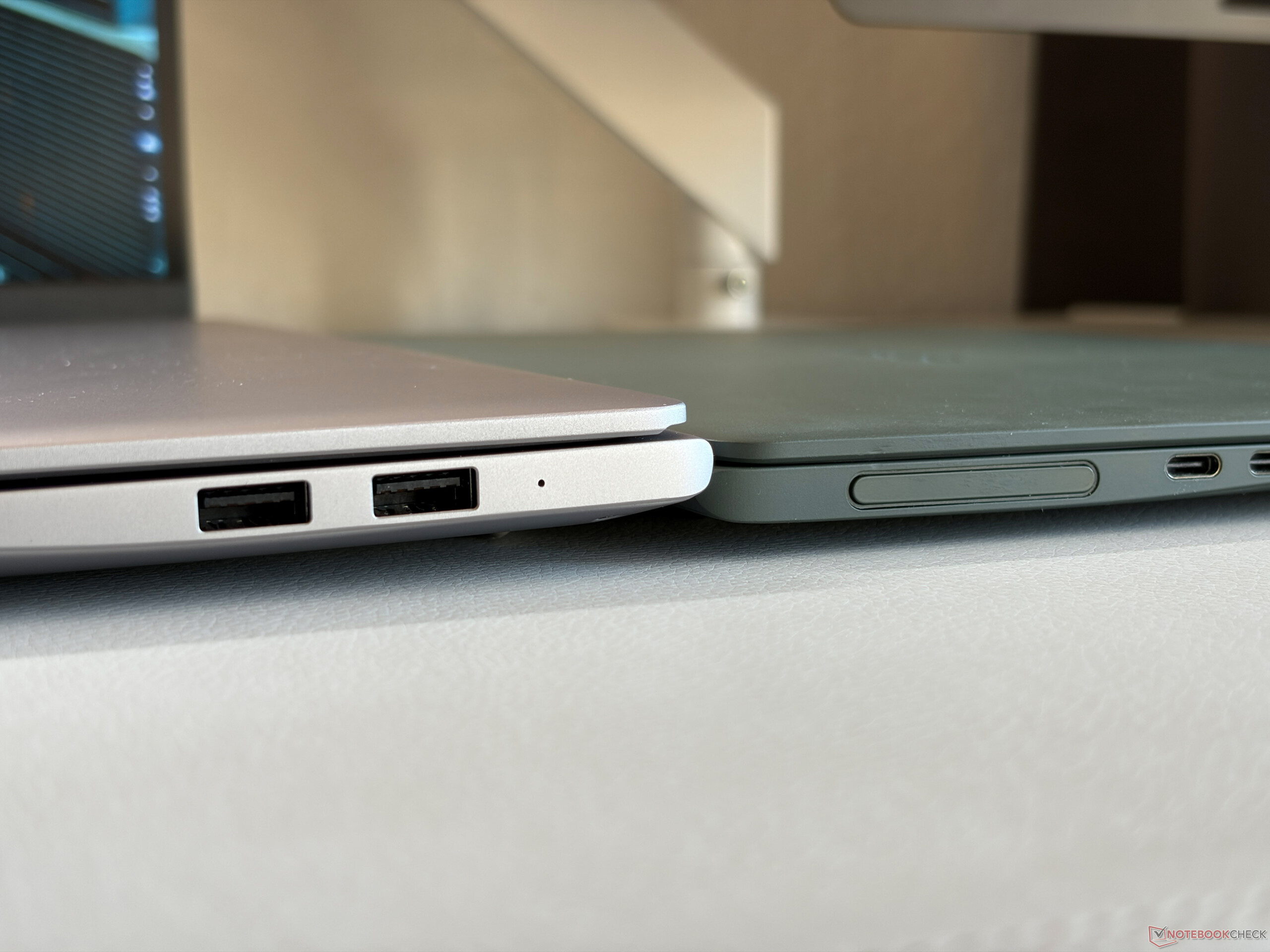 O senhor tem um total de quatro portas USB (1x Thunderbolt 4), bem como HDMI. O módulo Wi-Fi não é compatível com o Wi-Fi 7, mas ainda consegue taxas de transferência altas e estáveis em nosso teste. A webcam de 1080p (incluindo o sensor IR) tira fotos medianas.