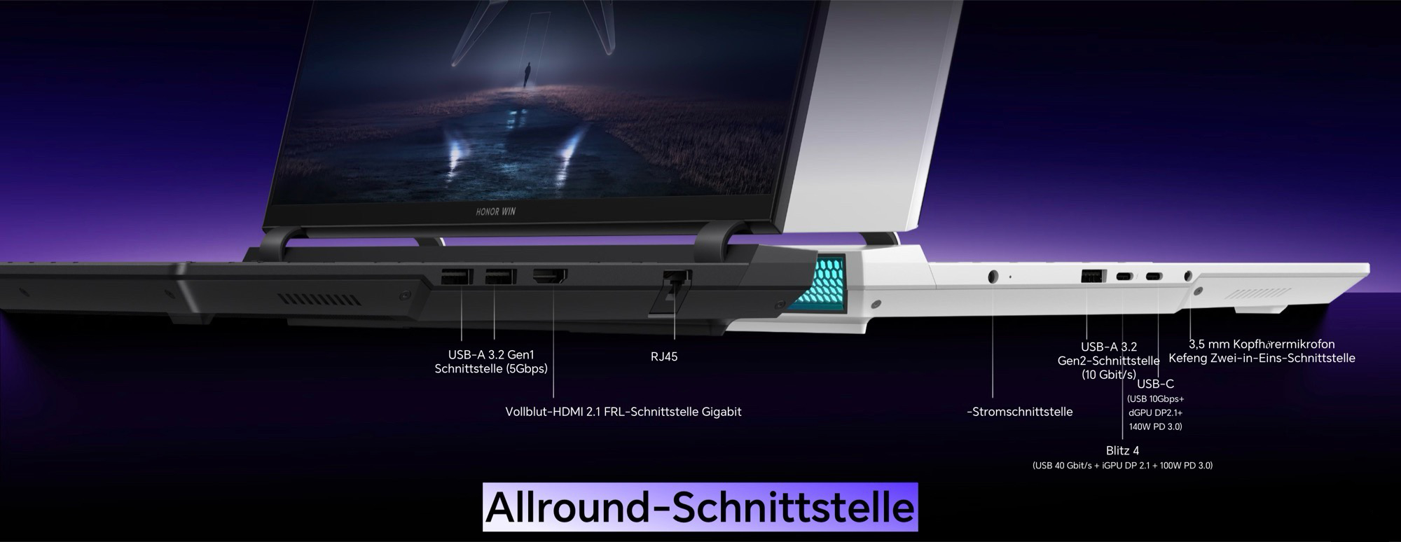 Desse total, um máximo de 140 watts é alocado para a GPU para laptop Nvidia GeForce RTX 5070 Tie o restante é consumido pelo Intel Core Ultra 9 290HX Plus. Honor usa um painel IPS de 16 polegadas no formato 16:10, que oferece uma resolução de 2.560 x 1.600 pixels, um brilho de 500 nits e uma taxa de quadros de 300 Hz; de acordo com Honor, o espaço de cores DCI-P3 pode ser exibido na íntegra. A bateria tem 92 Wh. Com Thunderbolt 4 (USB-C), USB-C 3.2 Gen 2, três portas USB-A, HDMI 2.1 e Ethernet, o laptop oferece uma ampla gama de conexões.