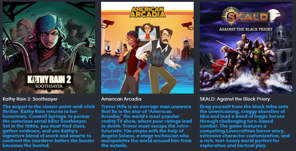 - Kathy Rain 2: Soothsayer - uma sequência de 2025 do primeiro jogo de apontar e clicar da série. Esse jogo Steam Deck Playable tem atualmente uma avaliação positiva de 96% dos jogadores e normalmente custa US$ 19,99.