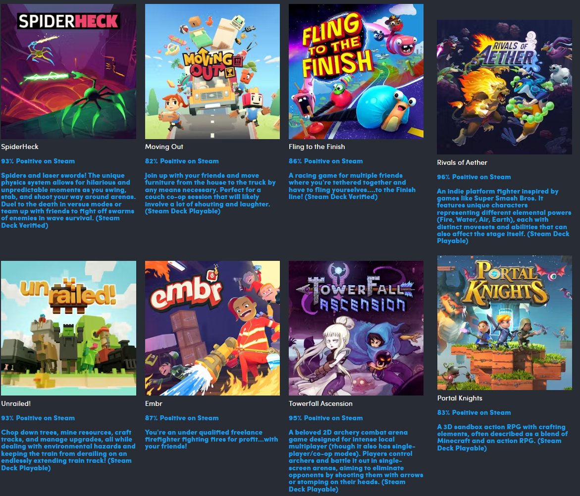 - Embr - classificado como um jogo multijogador imprevisível e frenético com recursos on-line e cooperativo local online e local. É bem recebido pelos jogadores, categorizado como Steam Deck Playable, e normalmente sai por US$ 19,99.