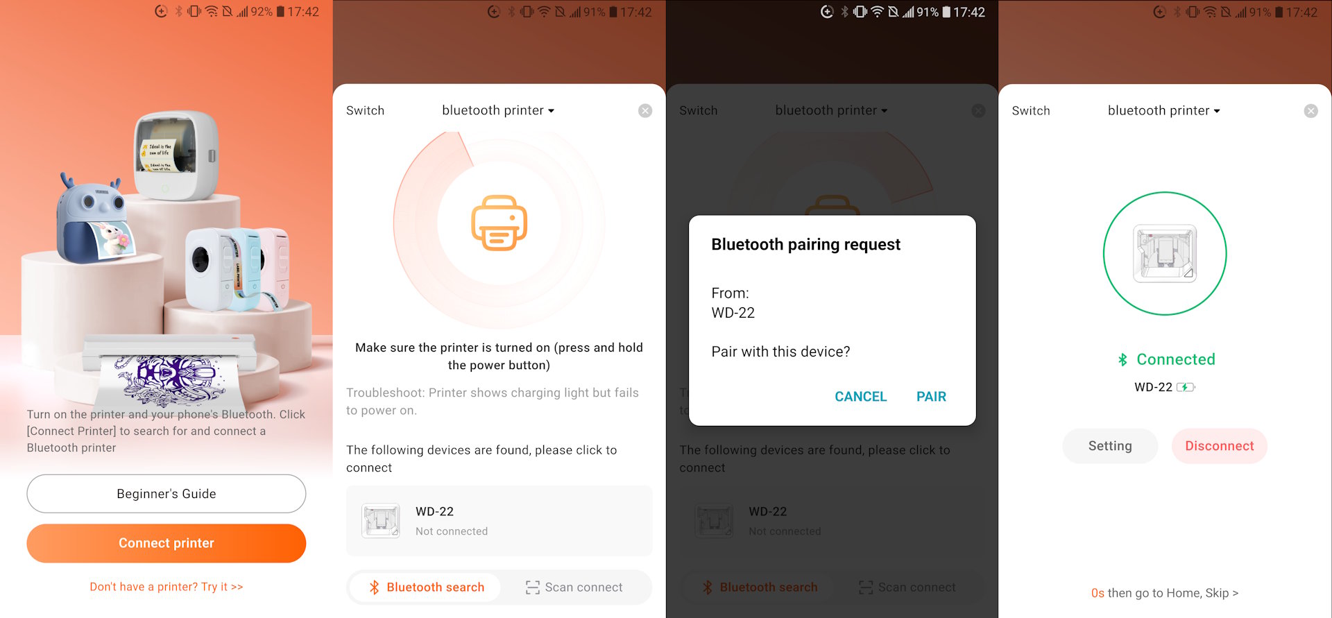 O aplicativo Android/iOS controla a impressora e exige que os serviços Bluetooth e de localização estejam ativados para que o Inkwon Tag se conecte.