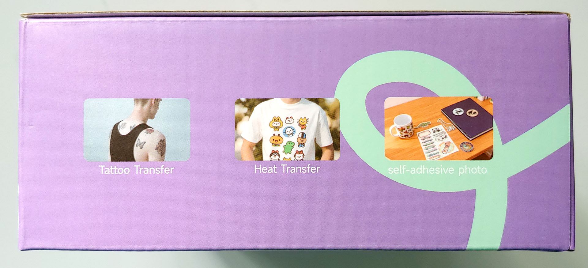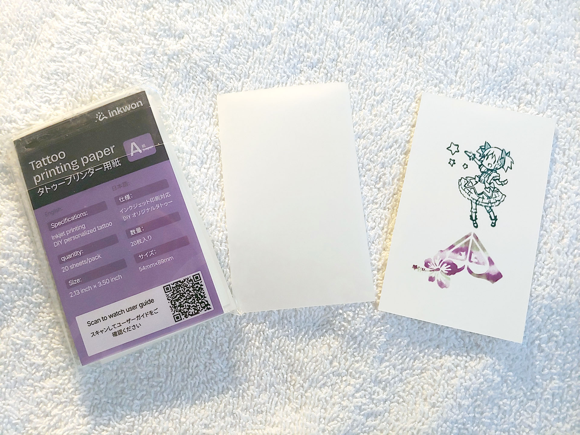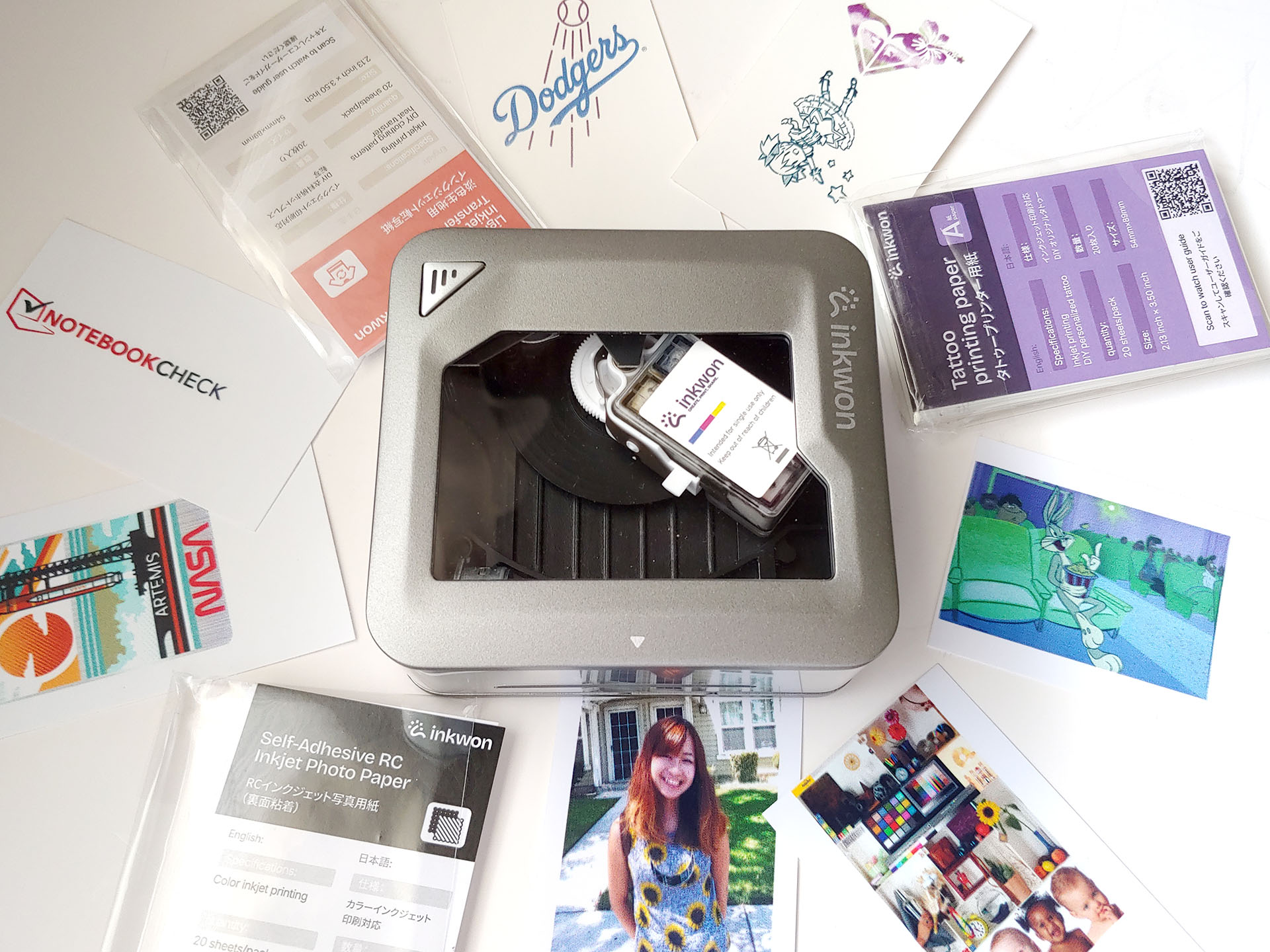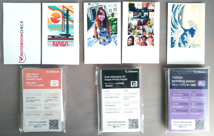 O Inkwon Tag vem com três tipos de papel: transferência térmica de tecido leve, papel fotográfico autoadesivo e papel de tatuagem, o que permite uma ampla gama de usos criativos. O kit de amostra também incluía itens para experimentar os ferros de passar.