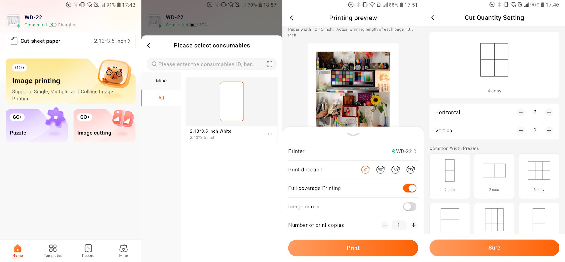 O aplicativo tem um design simples que é fácil de usar sem a necessidade de ler o manual. O canto superior esquerdo tem um ícone para a impressora, e tocar nele revela o status da impressora. No meio do aplicativo, há três seleções do menu principal - Impressão de imagens, Quebra-cabeça e Corte de imagens.