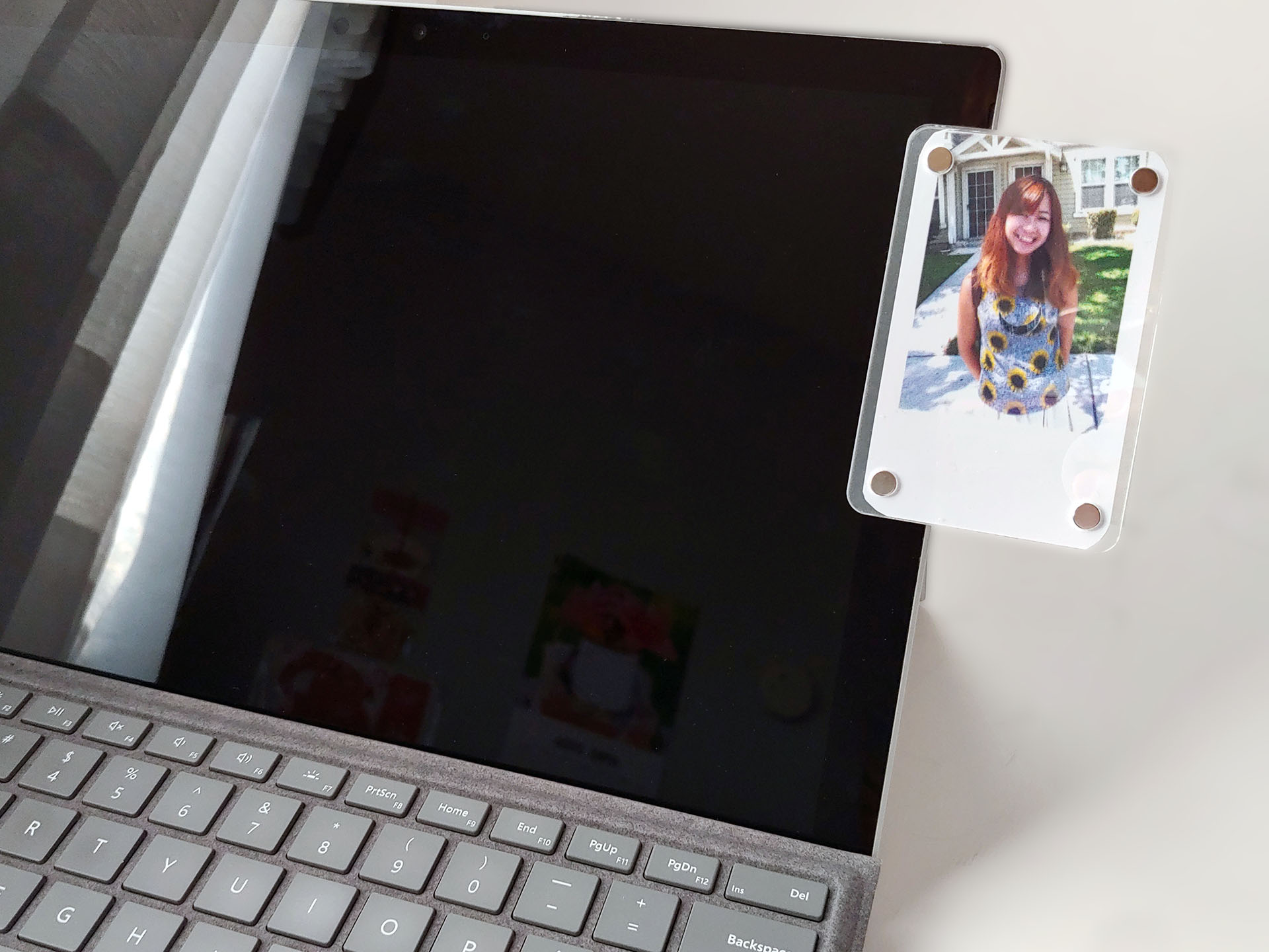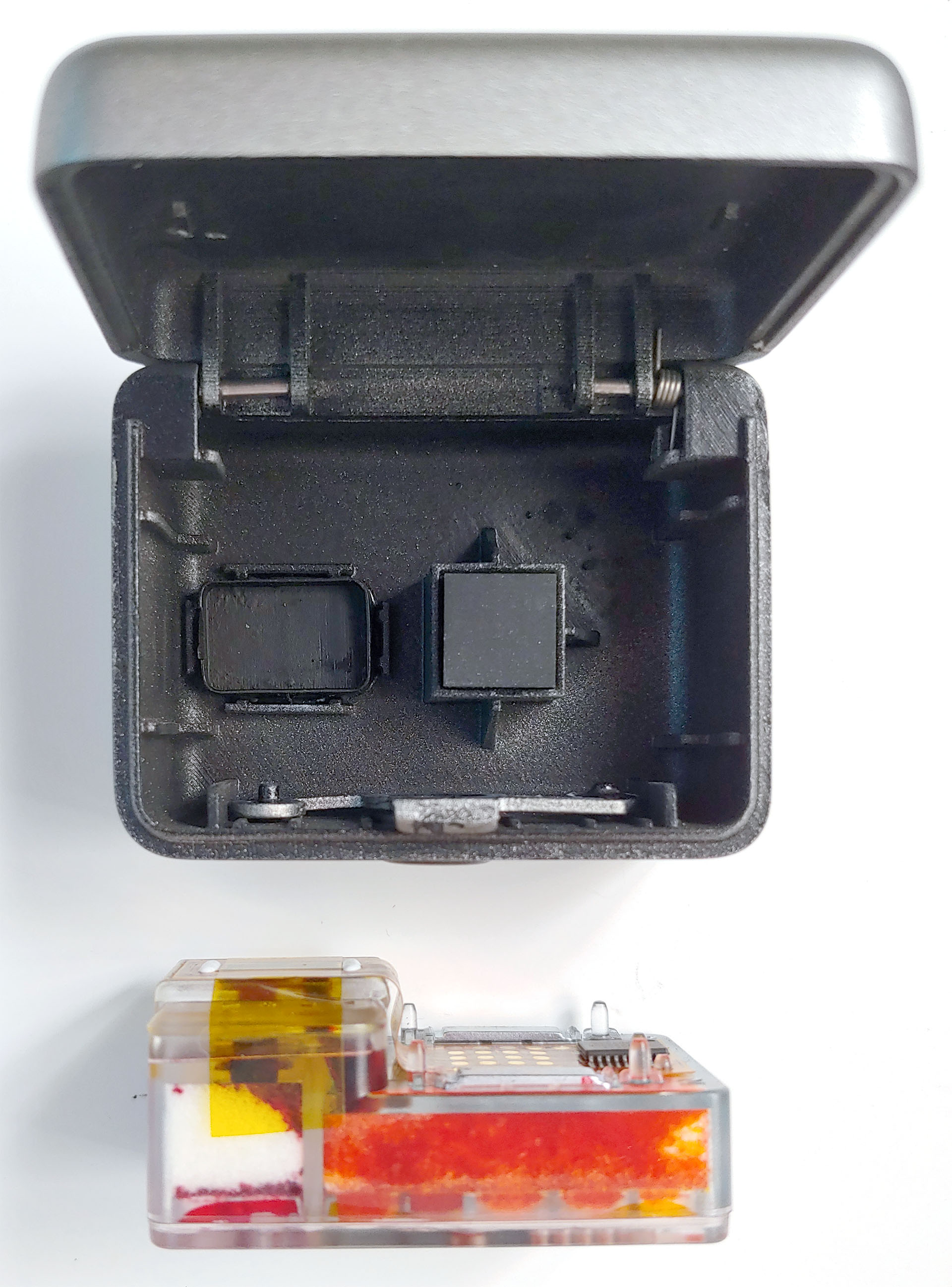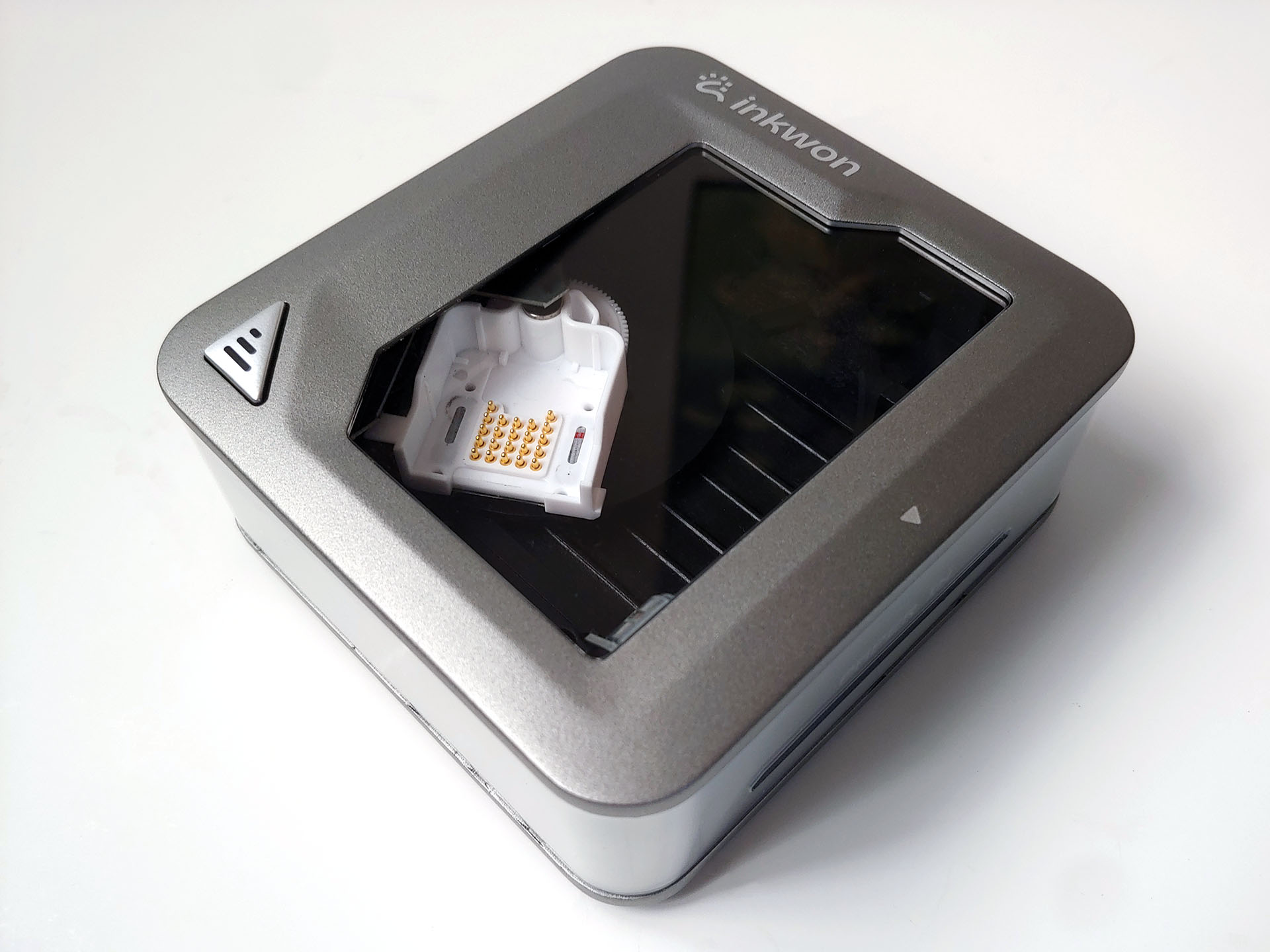 A tampa magnética transparente do Inkwon Tag é facilmente removida, revelando um cartucho que varre de um lado para o outro durante a impressão.