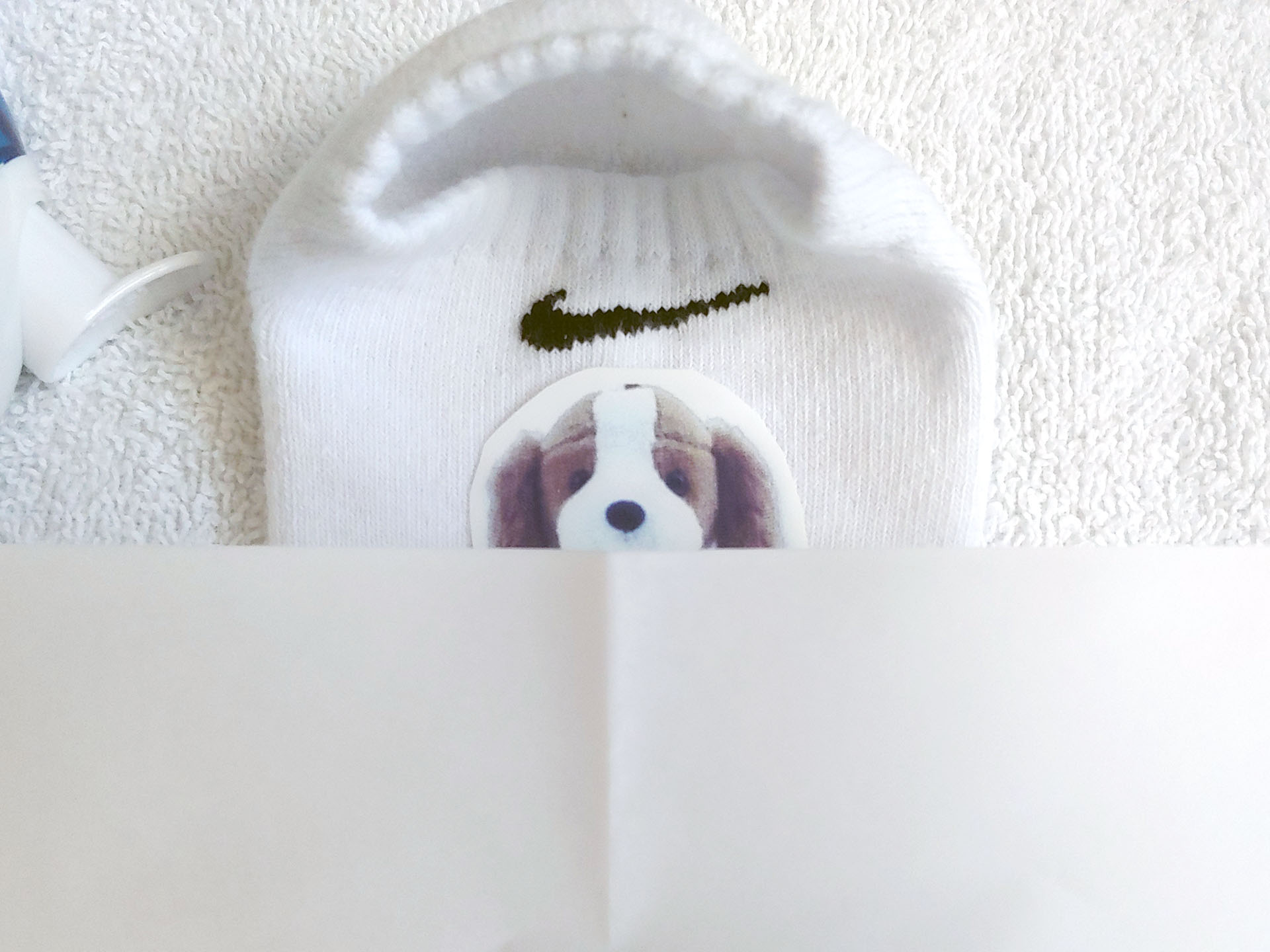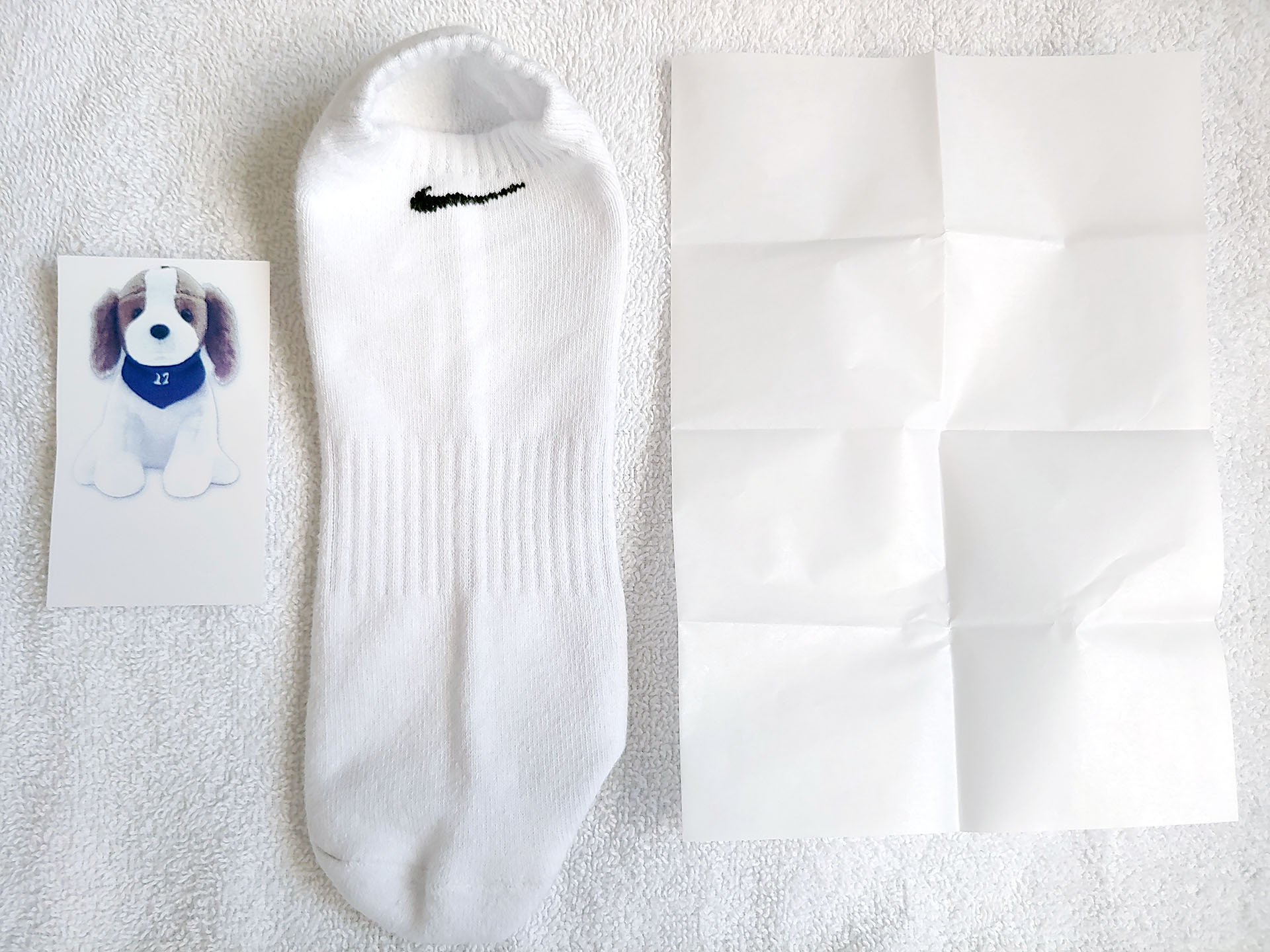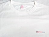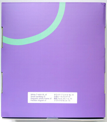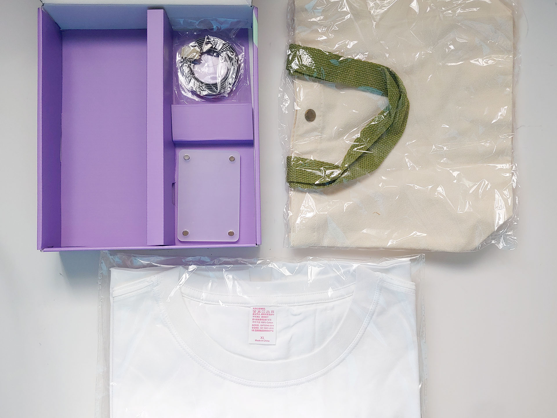 Foi fornecido um kit de amostra, que incluía uma camiseta branca, uma bolsa, um porta-retratos magnético e um ímã flexível.