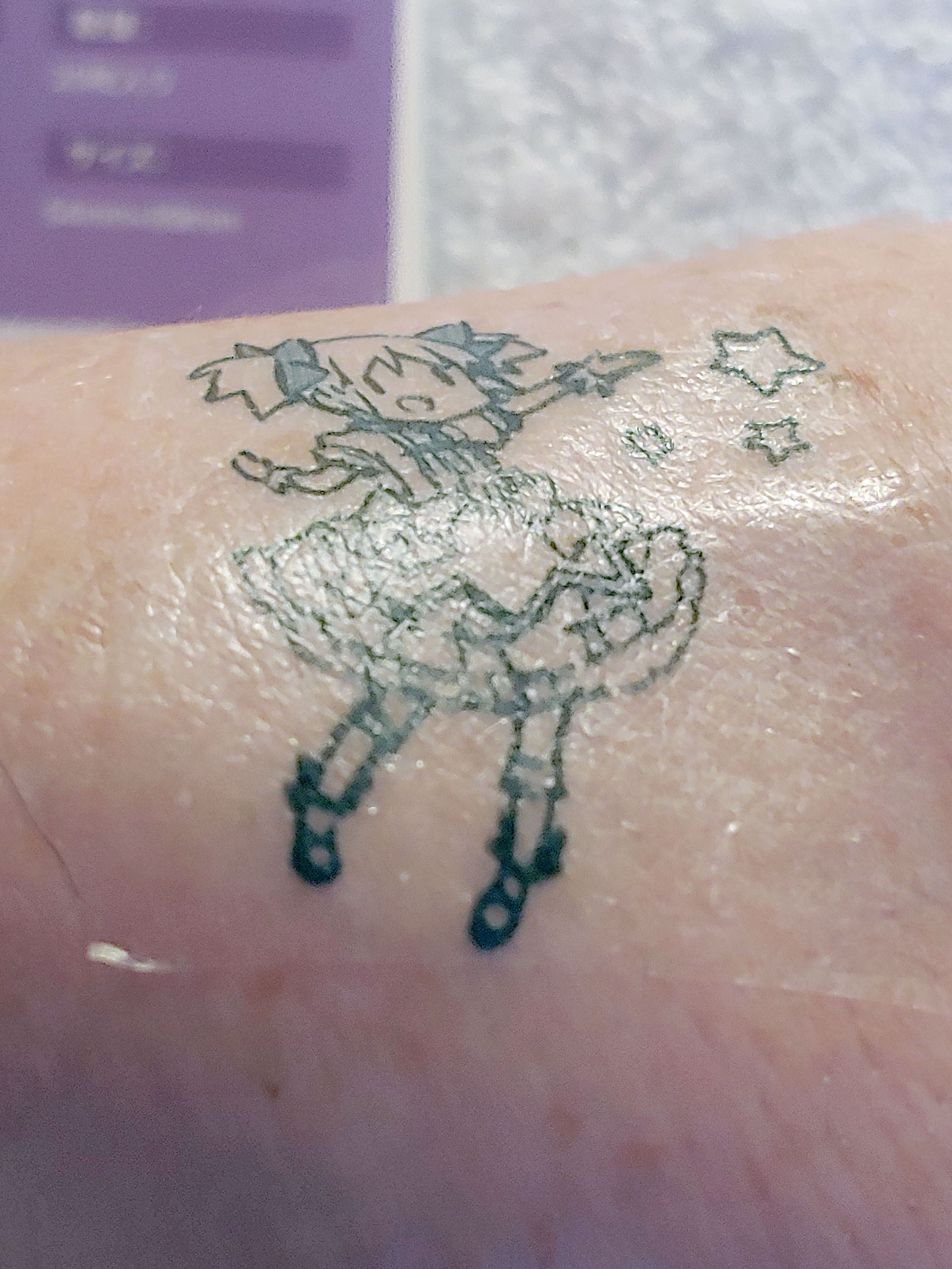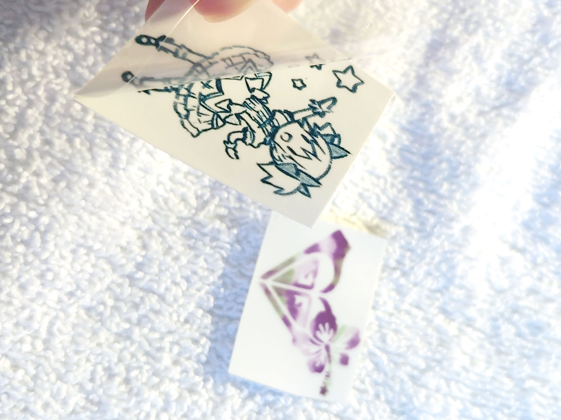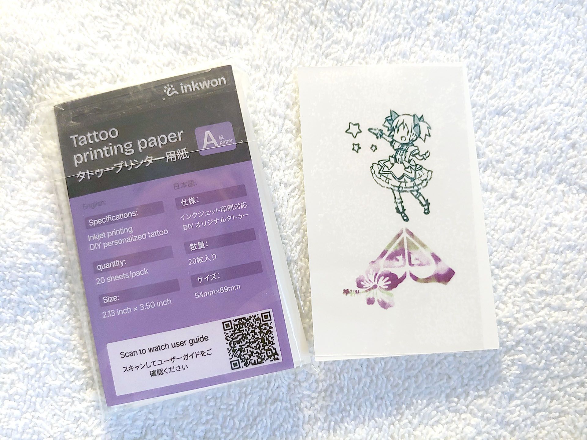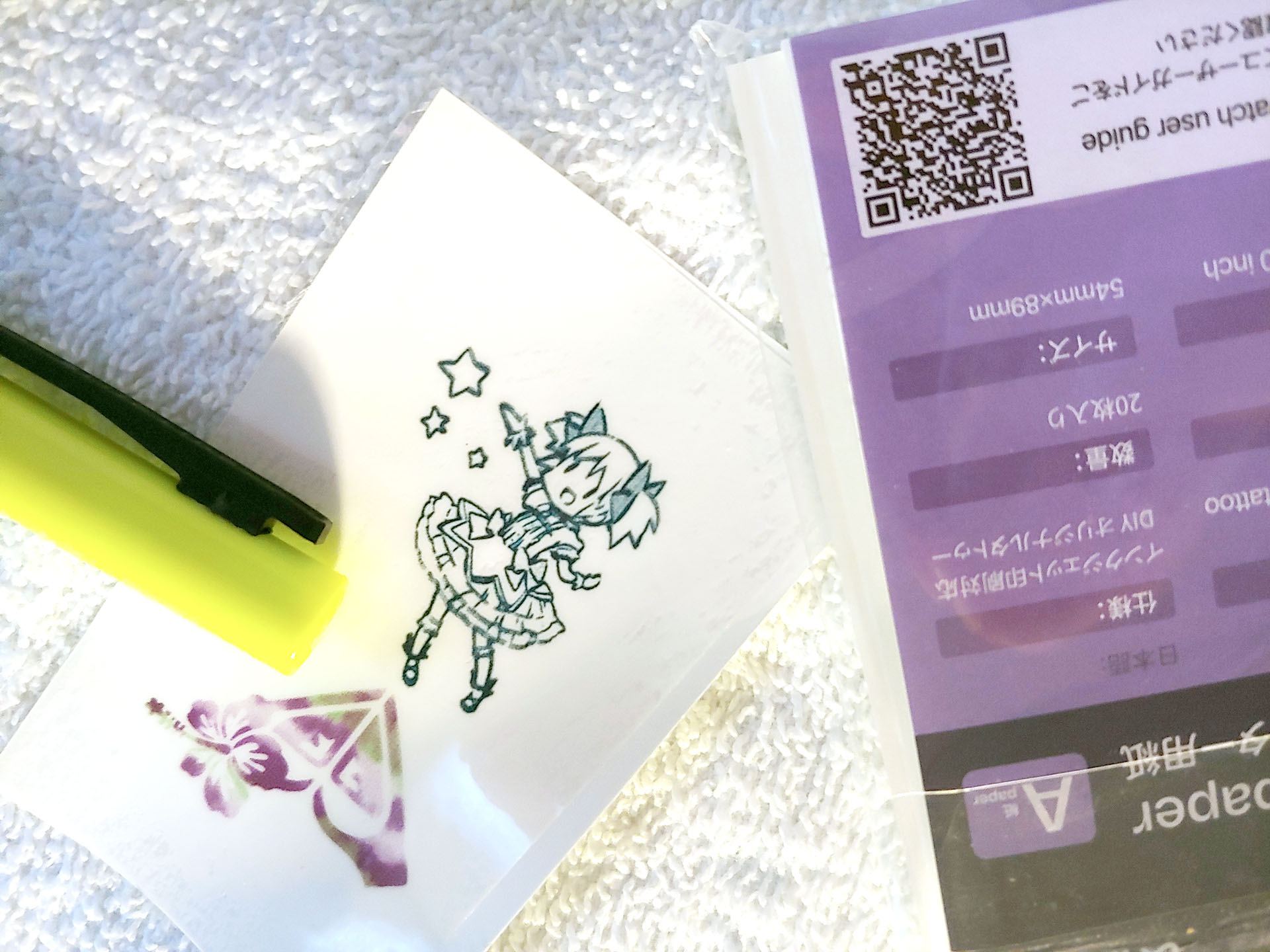 Os usuários podem experimentar ideias de tatuagens temporárias rapidamente. Uma folha transparente transfere um adesivo para a parte superior da tatuagem impressa e depois é descartada. A folha de tatuagem é colocada com a face voltada para baixo sobre a pele, molhada e removida para aplicar a imagem.