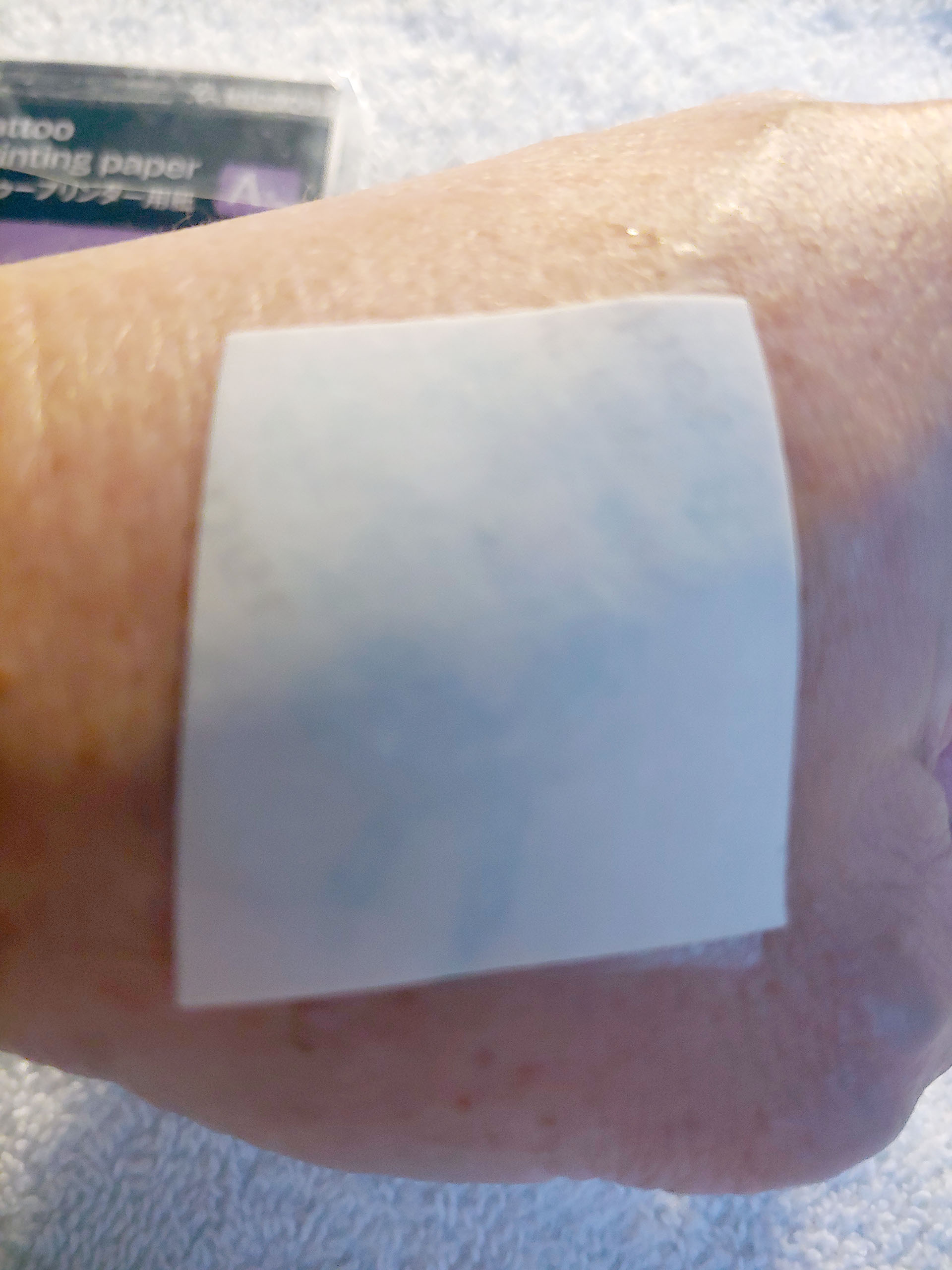 Aplique a folha adesiva transparente sobre a impressão da tatuagem, esfregue para remover as bolhas de ar, corte e remova a folha transparente.
