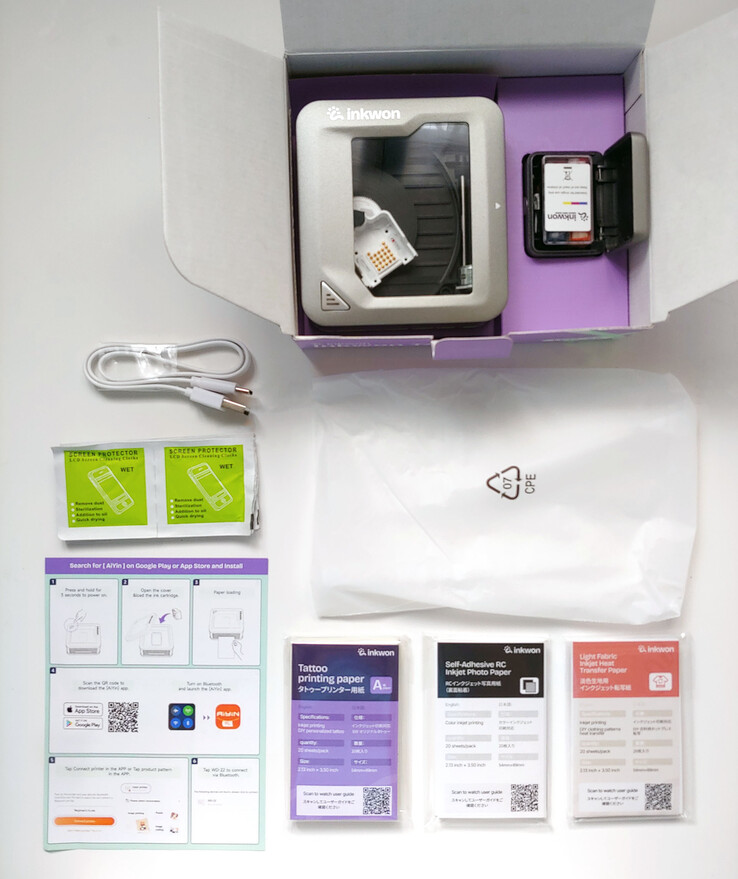 A caixa incluía a impressora Inkwon Tag, um guia de início rápido, um cabo de carregamento USB-C, um cartucho de jato de tinta e um suporte de cartucho, panos de limpeza da cabeça de impressão e um conjunto de papéis adesivos, de tatuagem e de transferência.