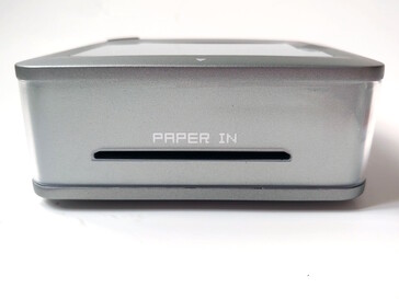 Slots de papel opostos lidam com a alimentação automática, com um orifício de reinicialização, porta USB-C e tampa de resíduos de tinta no outro lado. A impressora compacta cabe confortavelmente em bolsos grandes de jaquetas ou bolsas pequenas.