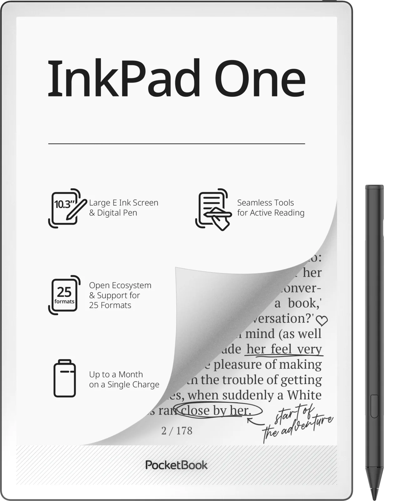 Além de visualizar o conteúdo, o e-reader também pode ser usado para fazer anotações. O InkPad One apresenta uma função de anotações que permite adicionar comentários e marcações usando a Stylus 2 incluída. O dispositivo com 5,15 mm de espessura também oferece reprodução de arquivos de áudio, como audiolivros e outros arquivos, via Bluetooth, bem como uma função de conversão de texto em fala para leitura de arquivos de texto em voz alta