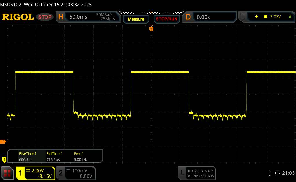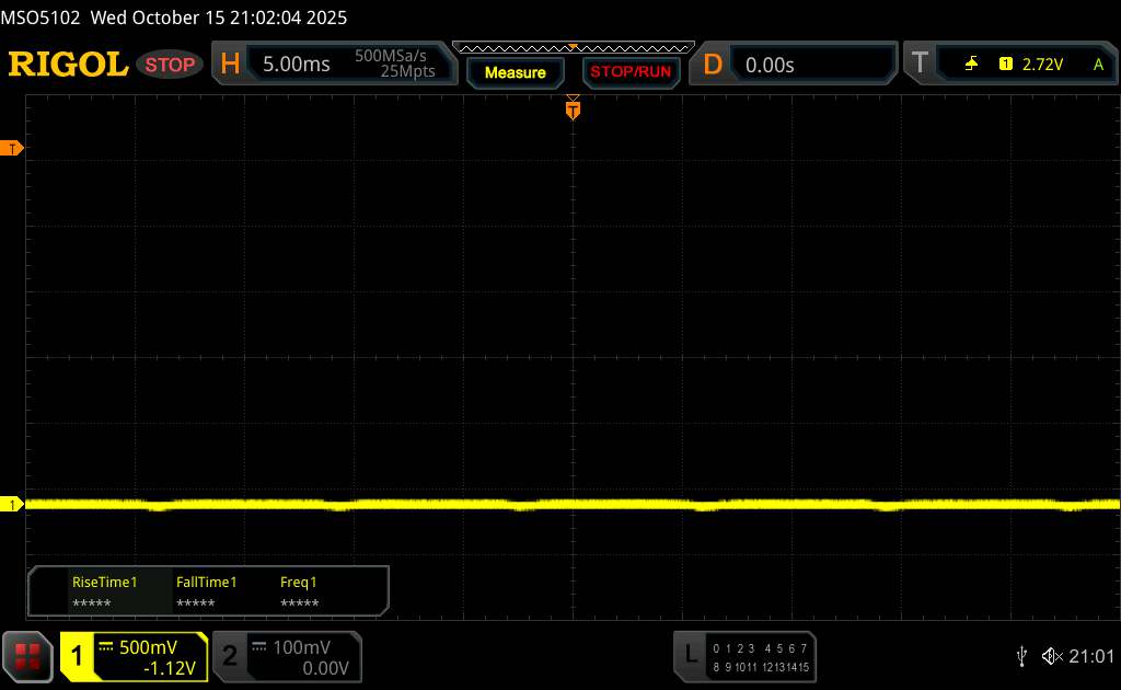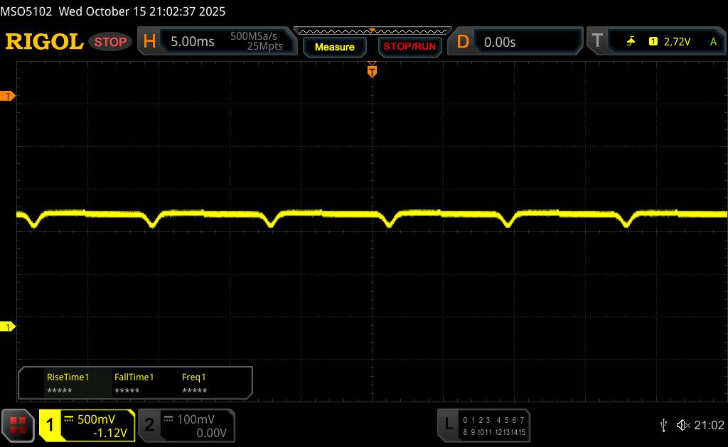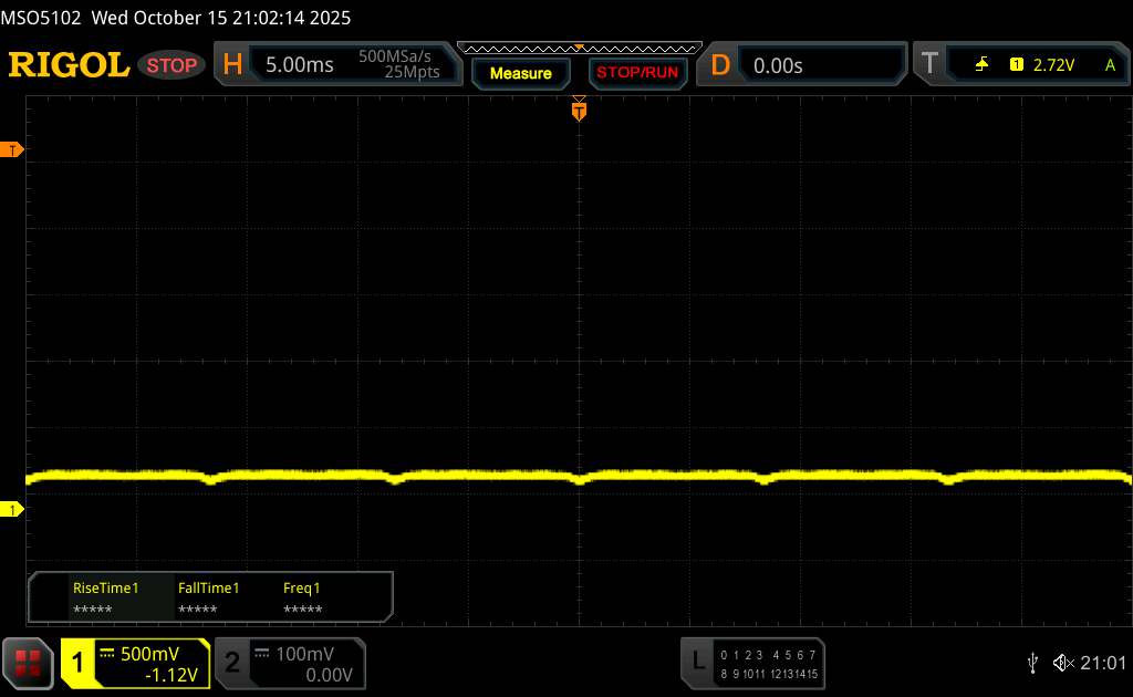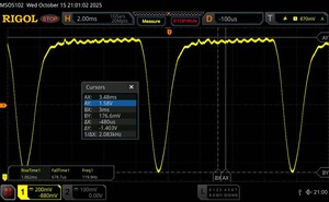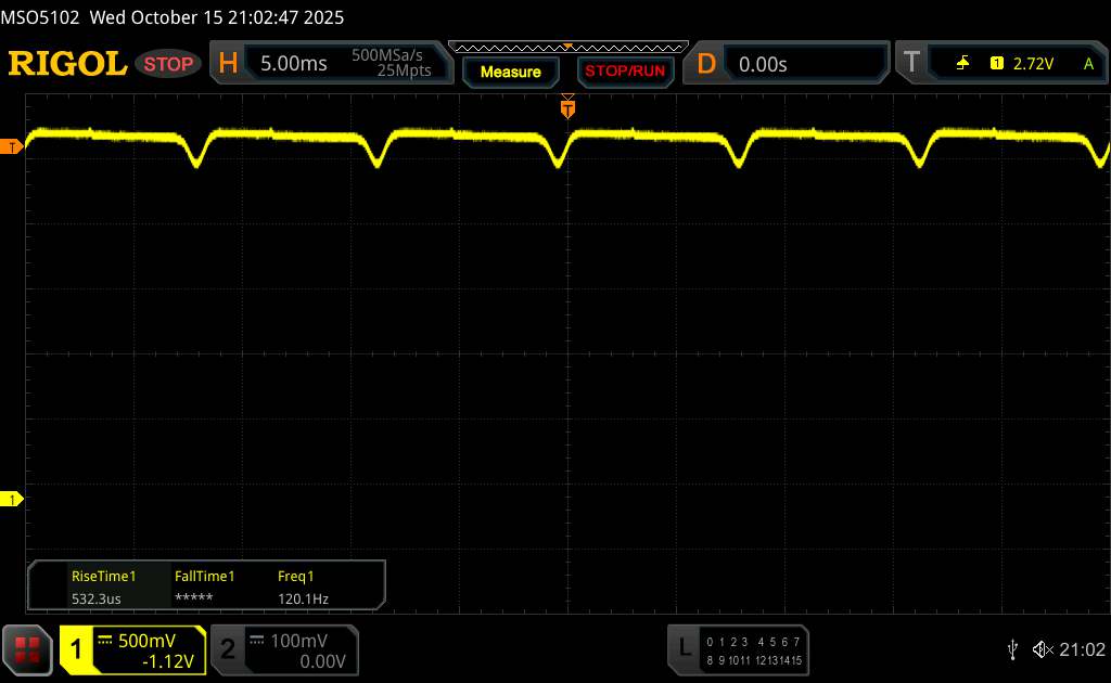 A oscilação típica do OLED é visível no osciloscópio, mostrando uma frequência base relativamente baixa de 120 Hz. No entanto, o escurecimento PWM de alta frequência e uma curva de amplitude rasa ajudam a reduzir a tensão visual.