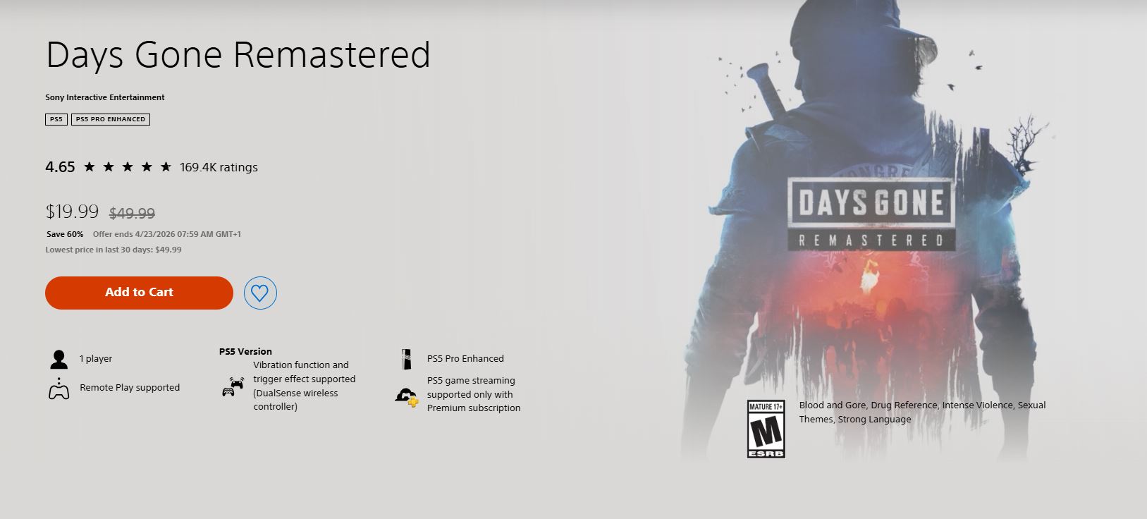 Days Gone Remastered foi lançado no final de abril de 2025 com um preço de US$ 49,99 no PlayStation 5, sendo que os proprietários da versão para PlayStation 4 podem comprar a atualização por apenas US$ 10. Desde então, o jogo recebeu vários descontos, mas o mais recente reduziu esse preço em 60% até 23 de abril, com o jogo agora disponível na PlayStation Store por US$ 19,99 - o preço mais baixo de todos os tempos. Como se trata de um exclusivo relativamente recente do PlayStation, esse provavelmente será o preço mais baixo por um bom tempo.