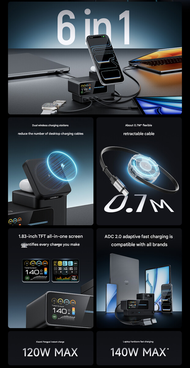 A Cuktech 15 Super Charging Station foi lançada na China como um novo carregador de mesa acessível. Entre os principais destaques estão as bases de carregamento sem fio duplas, uma para acessórios e outra para um telefone. Além dos carregadores sem fio, há um cabo retrátil embutido de 0,7 metro e um visor digital embutido.
