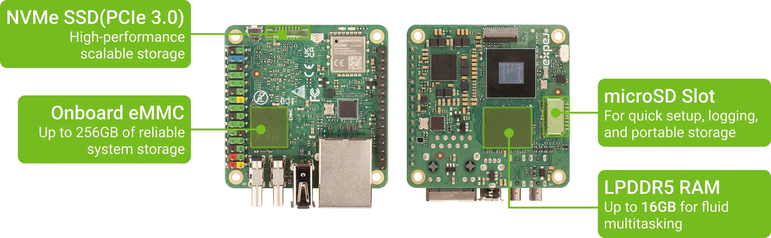 A alimentação também é fornecida via USB-C, com suporte para USB 2.0 e USB OPT. Além disso, há um total de 45 cabeçalhos GPIO disponíveis, e a placa de 51 x 51 mm apresenta um conector FPC com uma interface PCIe 3.0 (uma pista), permitindo a conexão de SSDs NVMe