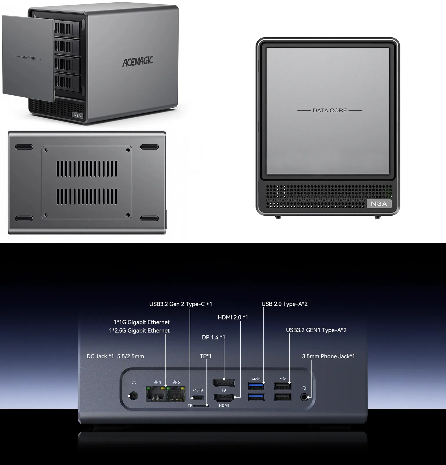 Em termos de design, o mini PC é fornecido com um corpo totalmente metálico e tem uma tampa frontal magnética. Os compartimentos de unidade SATA têm um mecanismo de fácil deslizamentopermitindo a rápida substituição e instalação do armazenamento. A Acemagic observa ainda que a configuração de resfriamento duplo do NAS garante um desempenho ideal 24 horas por dia, 7 dias por semana.