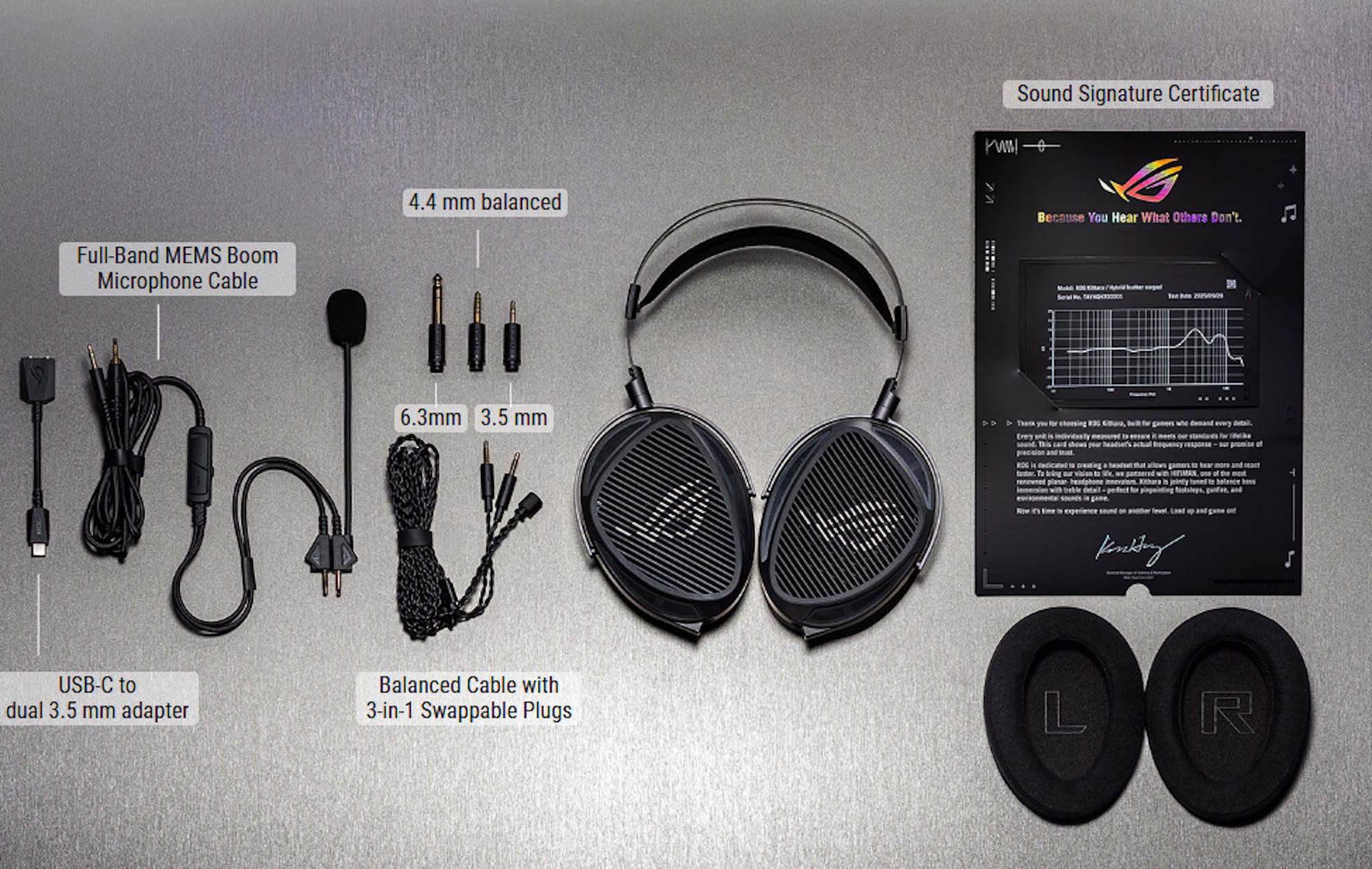 O ROG Kithara é um novo headset para jogos que já está disponível por US$ 299 na Amazon. Ele é equipado com drivers de 100 mm, especificamente drivers planar-magnéticos Hifiman, destinados a oferecer uma qualidade de áudio particularmente alta. De acordo com a Asus, o fone de ouvido cobre uma faixa de frequência de 8Hz a 55kHz. A Asus destaca ainda a clara separação entre graves, médios e agudos, que visa a melhorar a percepção espacial. Esse é um headset com a parte traseira aberta, portanto o ANC não seria prático, pois é mais provável que o ruído ambiente seja ouvido.