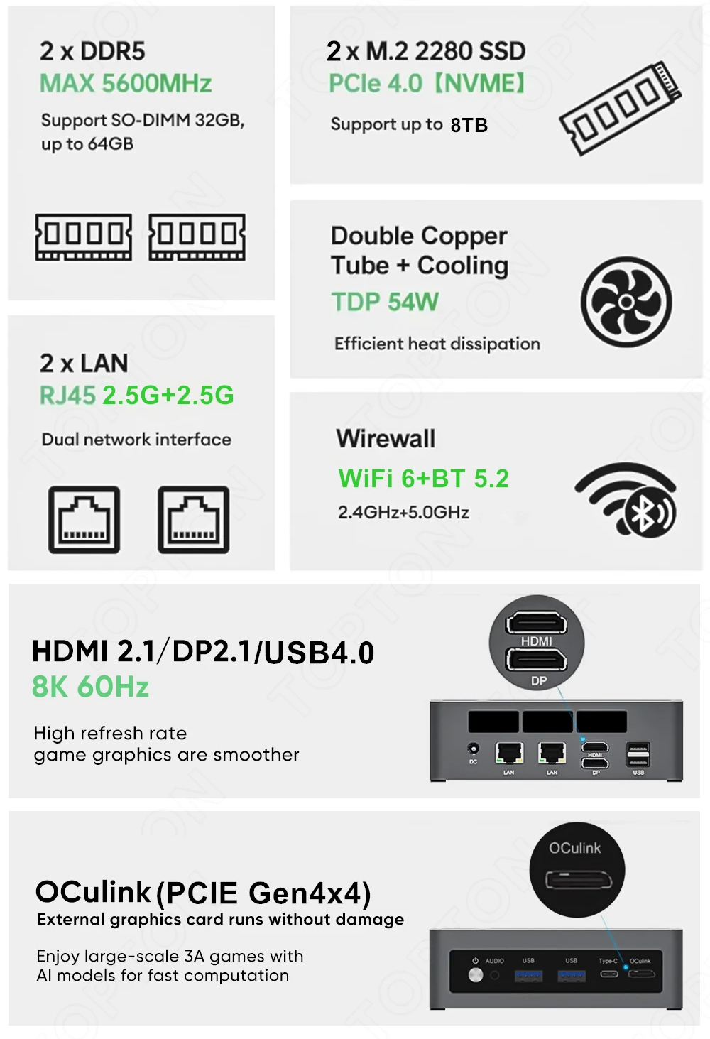 Há também uma porta OCuLink disponível, permitindo que os usuários combinem uma eGPU de alto desempenho de alto desempenho com o mini PC. Falando em portas, além da porta OCuLink, o Topton D12 Ultra tem as seguintes: