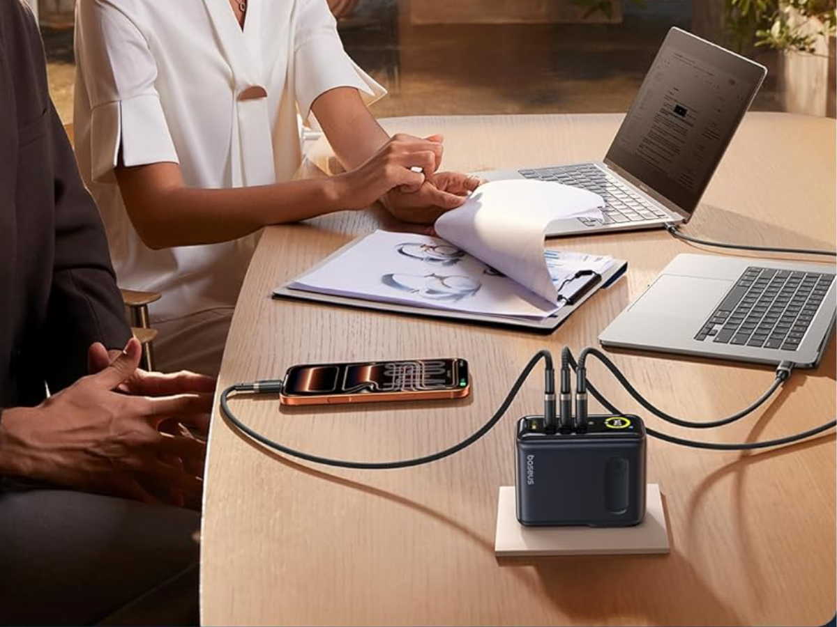 O PicoGo AH11 é um carregador de quatro portas, com três saídas USB-C e uma saída USB-A. A potência máxima de 140 W está disponível via USB-C, com a Baseus sugerindo que isso permitiria que o senhor carregasse um MacBook Pro 16 (M4) a 54% em meia hora. A empresa sugere que, ao carregar vários dispositivos simultaneamente, a energia é distribuída de forma inteligente. Por exemplo, o USB-C poderia oferecer 65W, 45W e 12W, respectivamente, com o USB-A fornecendo 12W.