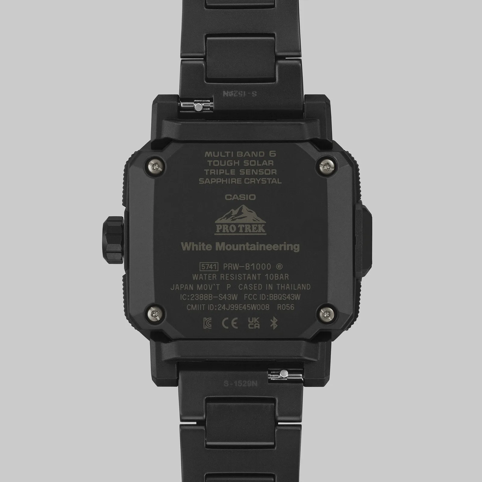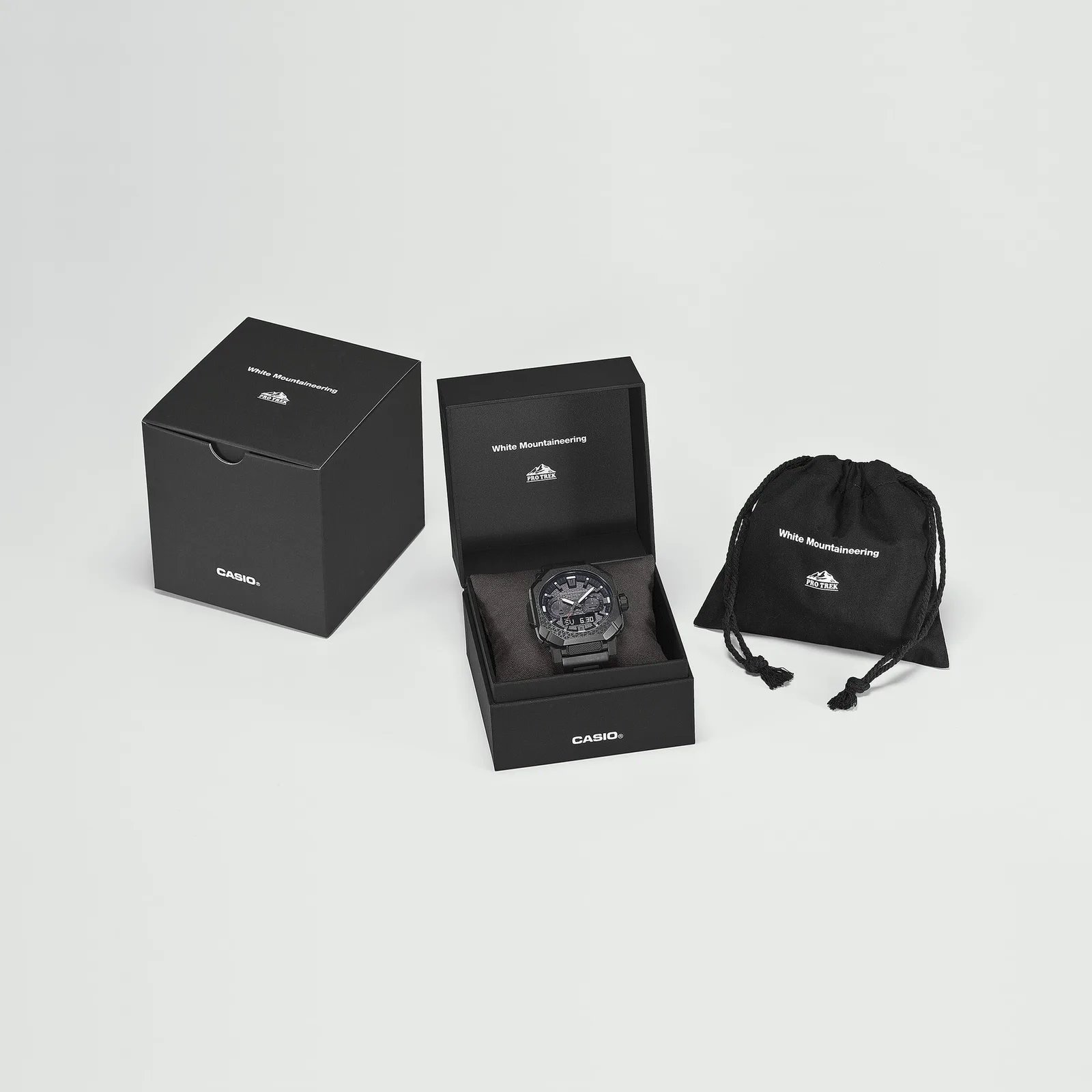 Casio e a marca de moda japonesa White Mountaineering finalmente confirmaram o lançamento em fevereiro de 2026 de seu segundo relógio colaborativo, o Pro Trek PRW-B1000WM-1. Afastando-se das construções de resina usadas em alguns relógios anteriores, essa iteração é baseada no relativamente novo chassi PRW-B1000, usando uma pulseira de titânio sólido e sensores técnicos avançados. O modelo custa aproximadamente ¥140.800 (~$900) e apresenta um design utilitário em preto fosco com o padrão triangular característico da White Mountaineering gravado no bezel de aço inoxidável banhado a íons.