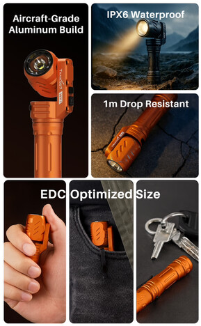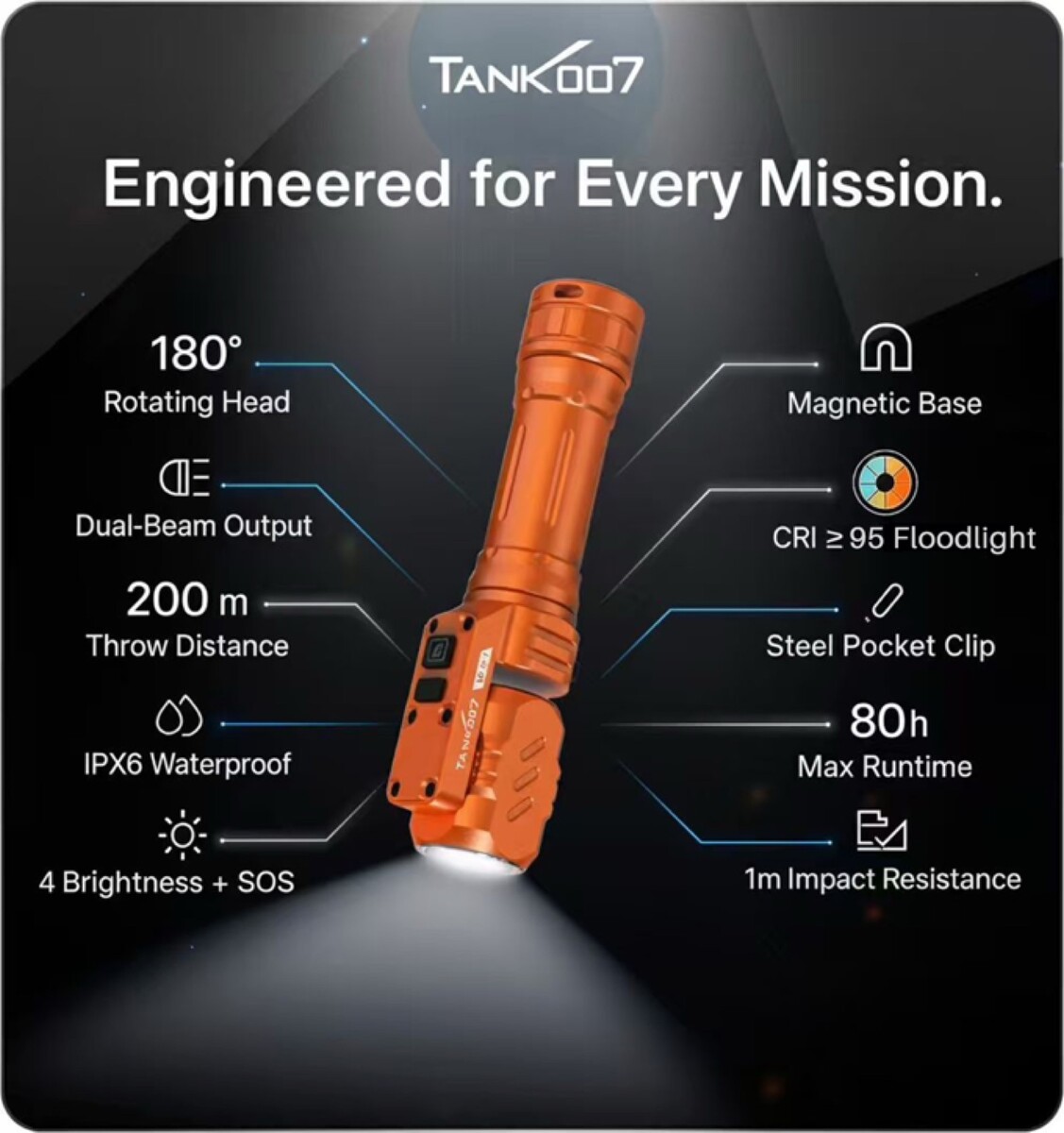 A Tank007 WK1 apresenta um invulgar invólucro de alumínio com certificação IPX6 e, portanto, protegido contra chuva, e permite que a cabeça da lâmpada seja girada em 180 graus. Isso não apenas torna a lâmpada mais ergonômica para segurar, mas também permite que a WK1 seja fixada em um gabinete de metal ou mesa magnética usando sua base magnética.