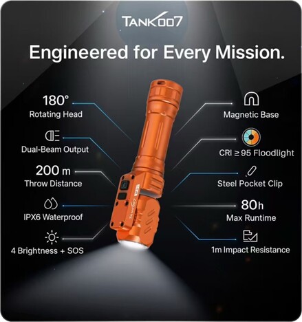 A cabeça pode então ser girada para usar a WK1 como uma lâmpada de mesa ou de parede, por exemplo. A Tank007 WK1 suporta dois modos. No modo holofote, a lâmpada gera um brilho de até 1.400 lúmens e um alcance máximo de 200 metros. No modo holofote, o brilho cai para 800 lúmens, mas a luz mais quente é emitida em um cone maior