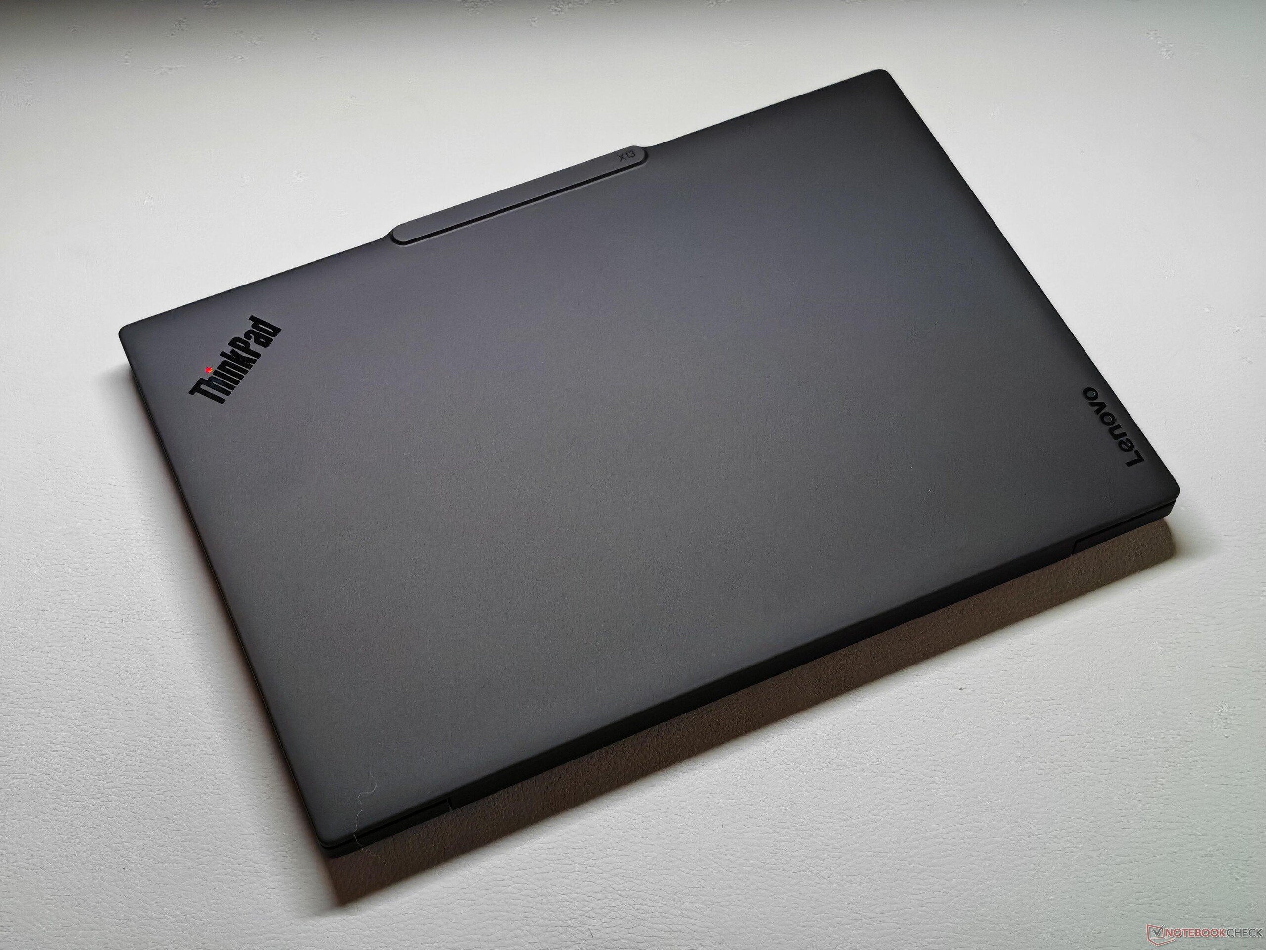 Visualmente, o novo X13 G6 é inconfundivelmente um ThinkPad e segue a linguagem de design atual, incluindo o compartimento da câmera bastante proeminente. Ao manusear o dispositivo, o tamanho compacto e o baixo peso são imediatamente perceptíveis. As superfícies têm um acabamento levemente texturizado que parece premium, não é muito propenso a impressões digitais e é relativamente fácil de limpar. A tampa é feita de plástico reforçado com fibra de carbono e a unidade de base é de alumínio. No entanto, o foco na mobilidade tem um impacto na rigidez geral. A unidade da base pode ser levemente pressionada na área central e produz um leve rangido quando é girada. A tampa em si é razoavelmente resistente, mas as dobradiças são o principal problema. O ângulo máximo de abertura é de 180 graus, mas as dobradiças são um pouco frouxas demais e balançam muito. A tampa inferior é fixada com apenas quatro parafusos e é fácil de remover. A ventoinha, a bateria, o módulo WWAN e o SSD podem ser reparados, embora a RAM e o módulo WLAN sejam soldados.