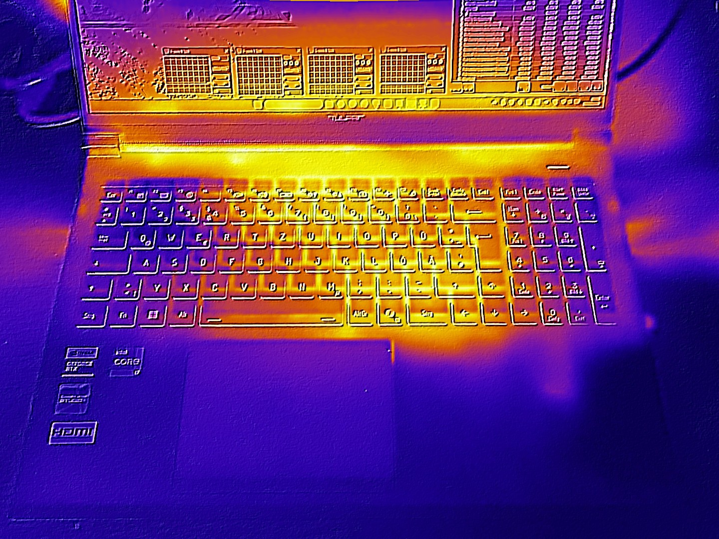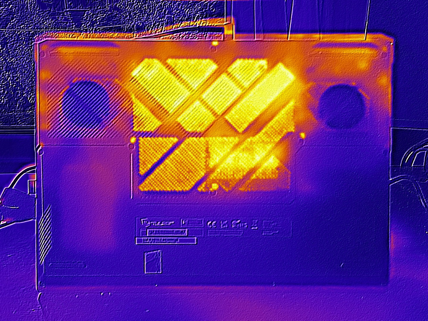 O invólucro de plástico oferece uma estabilidade mais do que decente e tem um acabamento impecável na maioria das áreas. As dobradiças funcionam discretamente na maior parte do tempo, embora o ângulo máximo de abertura de aproximadamente 135° não seja particularmente generoso. As superfícies em cinza escuro dão ao laptop uma aparência bastante discreta, desde que a luz de fundo do teclado esteja desligada.