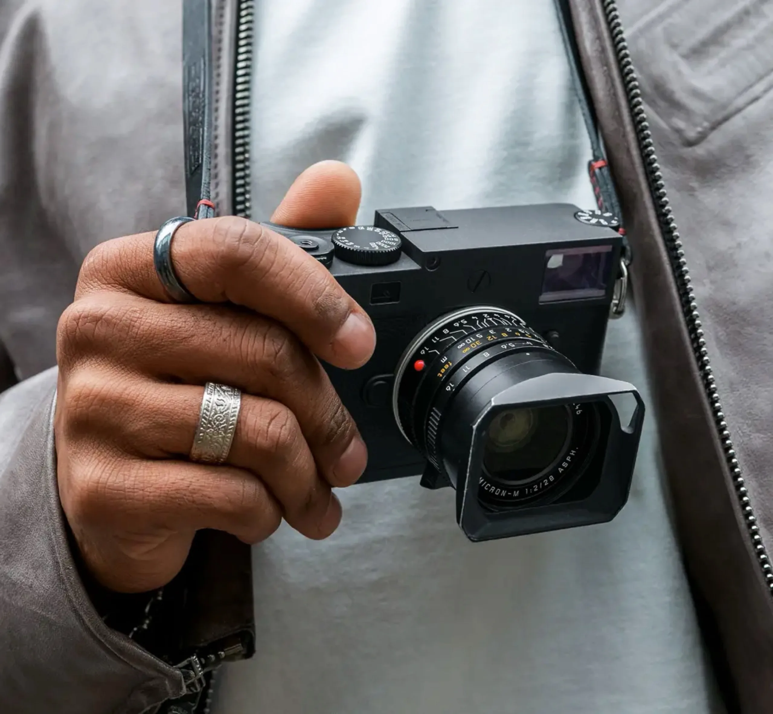 O design da foto tem duas vantagens em relação ao da Leica M11. Primeiro, o controle deslizante que libera a bateria do corpo pode ser operado mais facilmente em sua nova posição, enquanto uma placa de liberação rápida é fixada na câmera. Em segundo lugar, a Leica adiciona três contatos metálicos para acessórios. Na Leica Q3, eles são usados para uma alça de mão que permite que a câmera carregue sem fio em uma base de carregamento Qi.