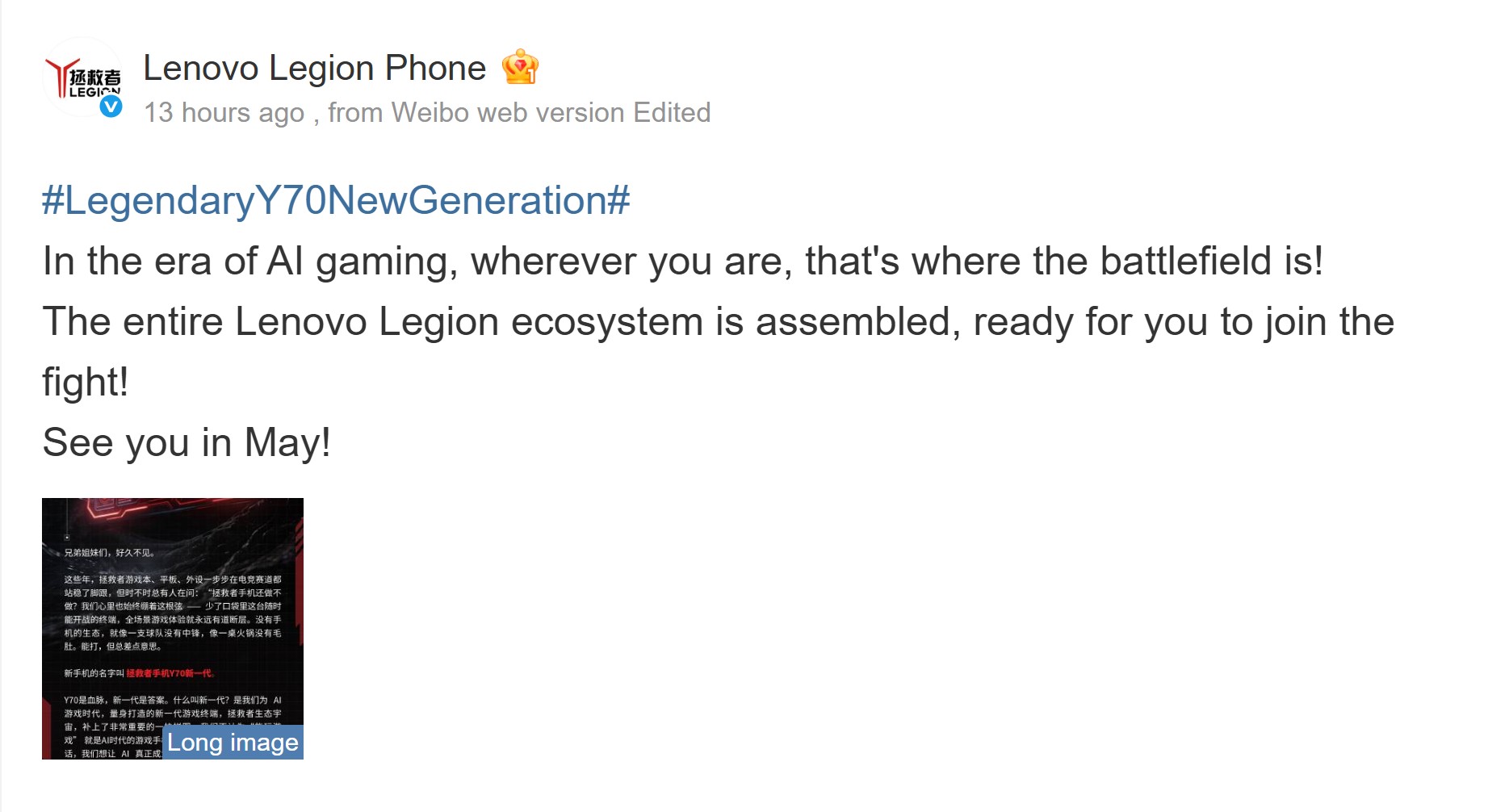 Com um anúncio não tão inesperado, a empresa confirmou que anunciará um novo telefone para jogos Legion em breve. A marca não compartilhou muito, mas disse que o lançamento está previsto para maio de 2026.