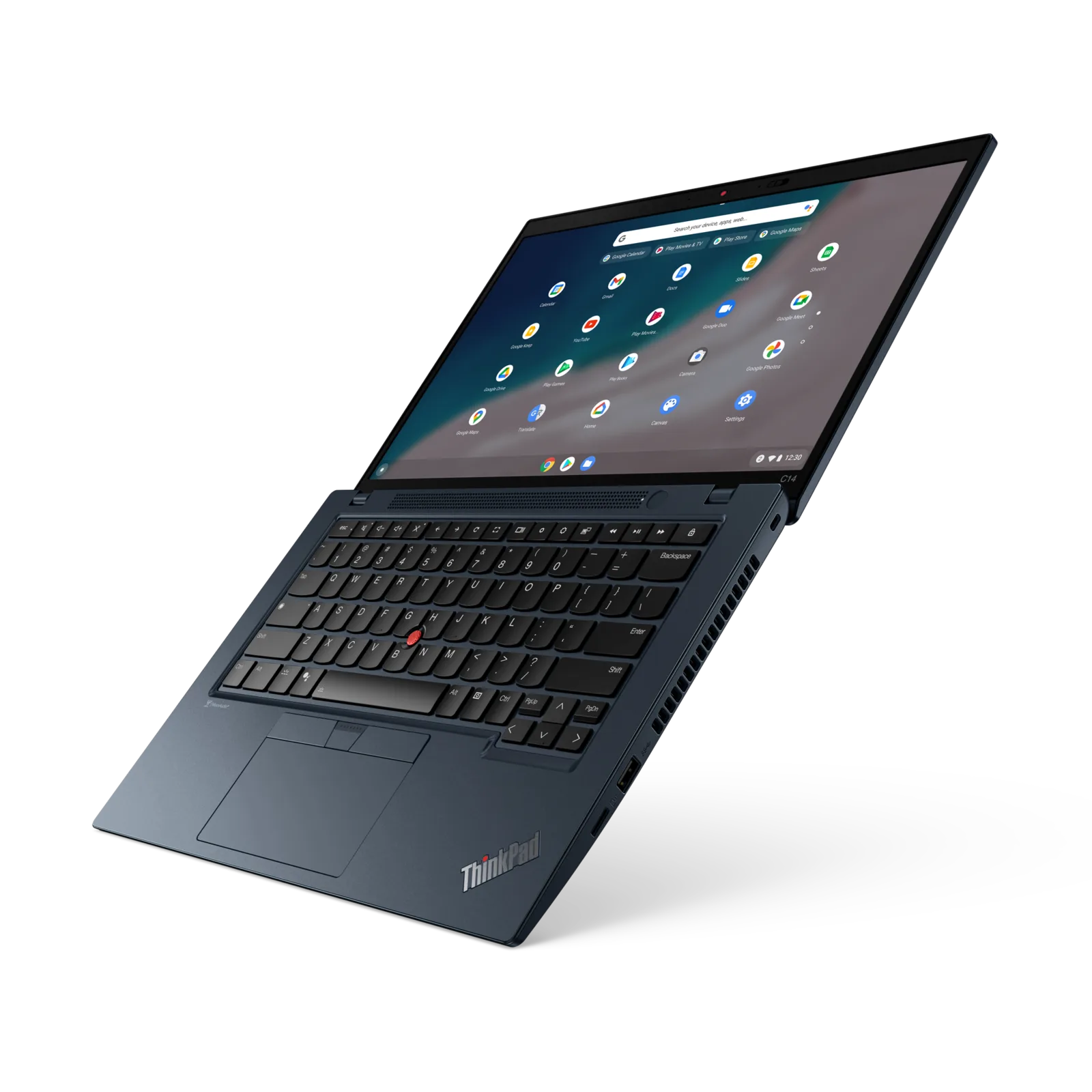 Como o ThinkPad C13 Yoga, o C14 é revestido em um chassi azul, um diferenciador dos tradicionais ThinkPads que são pretos. Porém, ele faz esporte com o TrackPoint, que é uma característica única entre os Chromebooks. Como um dispositivo comercial, o ThinkPad C14 oferece LTE, ele também tem um obturador de privacidade com webcam