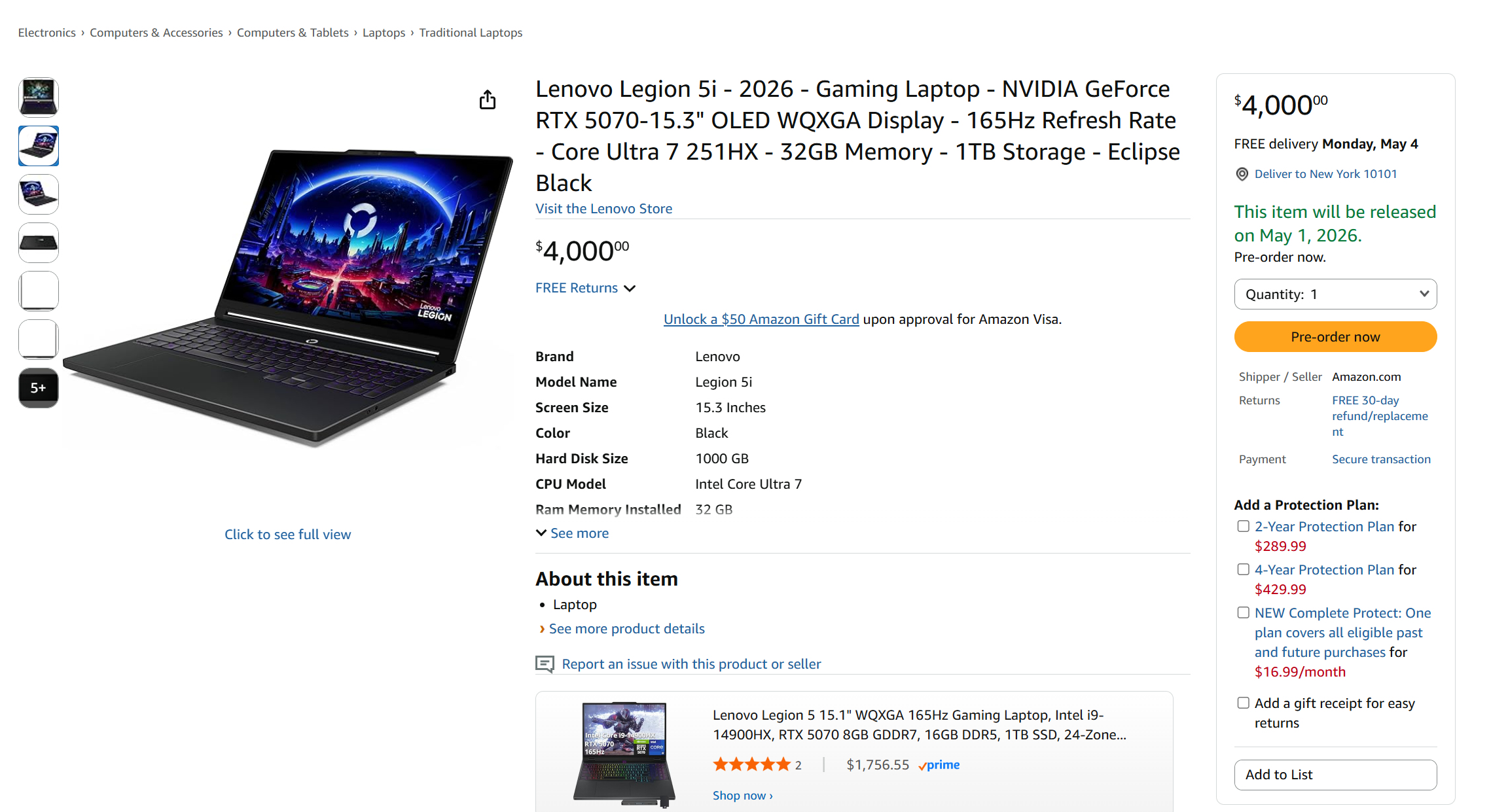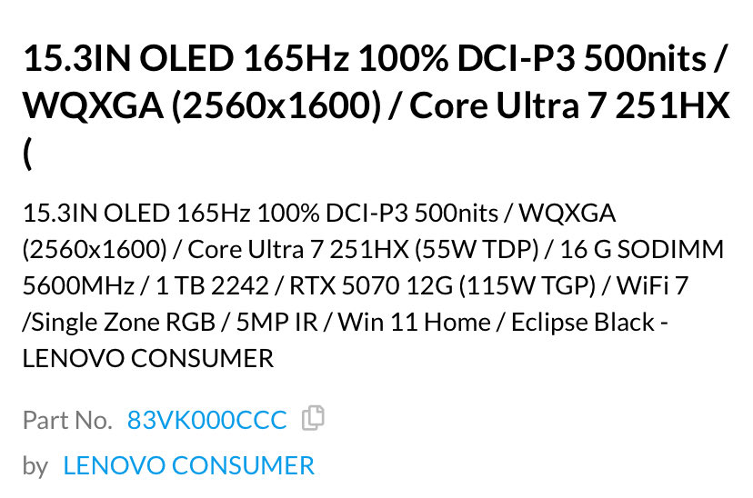 Enquanto isso, o usuário X Huang514613 viu diferentes versões sendo vendidas na Cendirect Canada e na Amazon US por US$ 4.000. Como mostra a imagem abaixo, a Lenovo listou o Legion 5i com uma tela OLED de 15,3 polegadas, 1 TB de armazenamento e 32 GB de RAM em um acabamento Eclipse Black. Em outras palavras, isso corresponde ao hardware das variantes Panther Lake existentes.