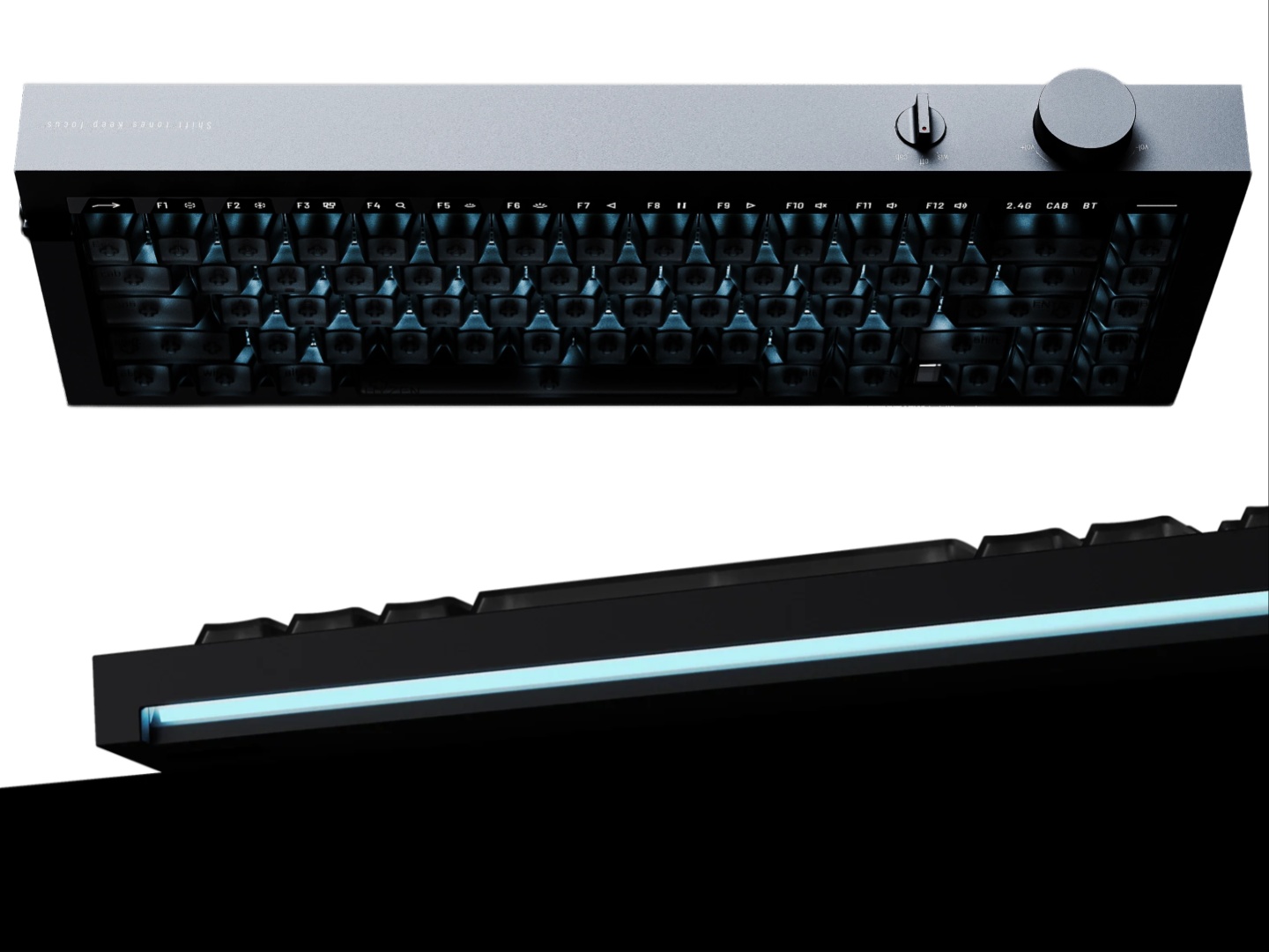 Quanto ao design, o chassi foi usinado em CNC a partir de um único bloco de alumínio. Trata-se de um teclado com 65% de funções, mas integra de forma inteligente a linha de funções por meio de um botão de alternância dedicado e indicadores LED. Há um botão para controle de áudio e uma chave seletora de três vias para os modos de energia, com fio e sem fio. Embora não haja pés na parte inferior, a Lofree adicionou uma inclinação de 12 graus para uma posição de digitação mais ergonômica. O Hyzen também tem uma barra de luz LED na parte inferior, voltada para baixo.