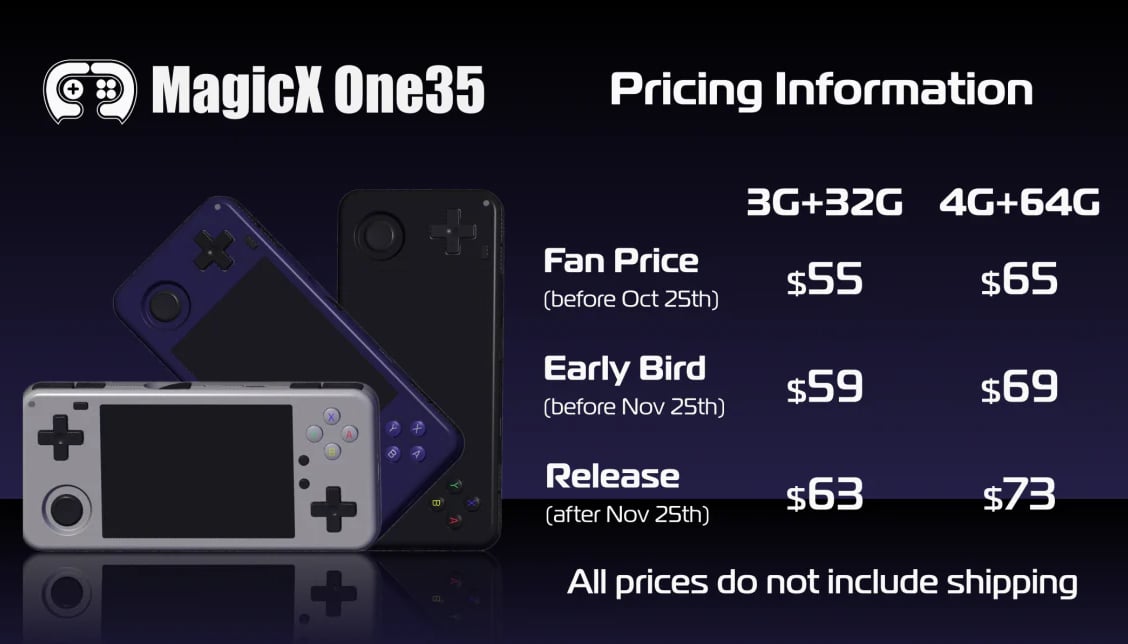 Atualmente, o One 35 pode ser adquirido em no site da MagicX por US$ 55 com 3 GB de RAM e 32 GB de armazenamento. No entanto, esse preço só é válido até 25 de outubro, após o qual o One 35 começará a custar US$ 59 antes de subir para US$ 63 em 25 de novembro. Como alternativa, o One 35 pode ser configurado com 4 GB de RAM e 64 GB de armazenamento por US$ 65, US$ 69 entre 25 de outubro e 25 de novembro e US$ 73 após 25 de novembro. Independentemente do preço, o MagicX One 35 deve começar a ser enviado globalmente em 26 de novembro.