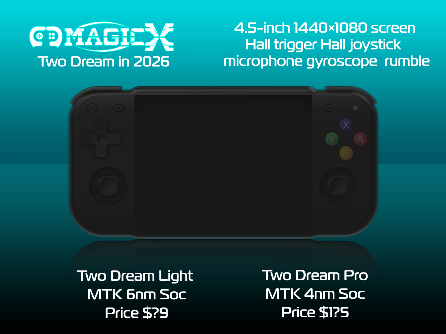 Agora, a MagicX confirmou a chegada iminente de dois novos dispositivos portáteis. Até o momento, não está claro se a empresa planeja lançar o One Retro 45, One Flip 50 e Two DS 46 primeiro. Enquanto aguardamos mais detalhes sobre esses três dispositivos portáteis, a MagicX apresentou informações iniciais sobre o Two Dream Light e o Two Dream Pro.