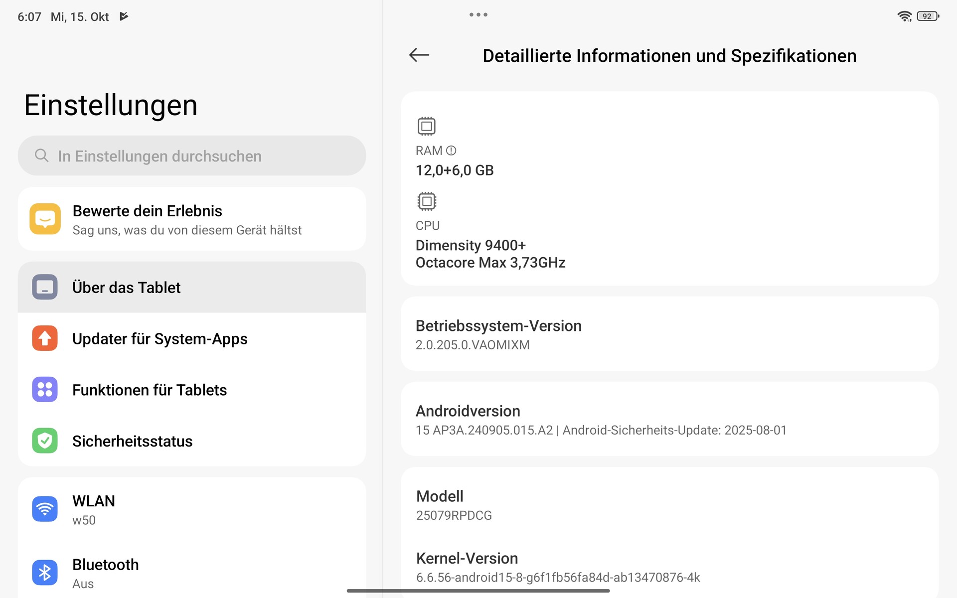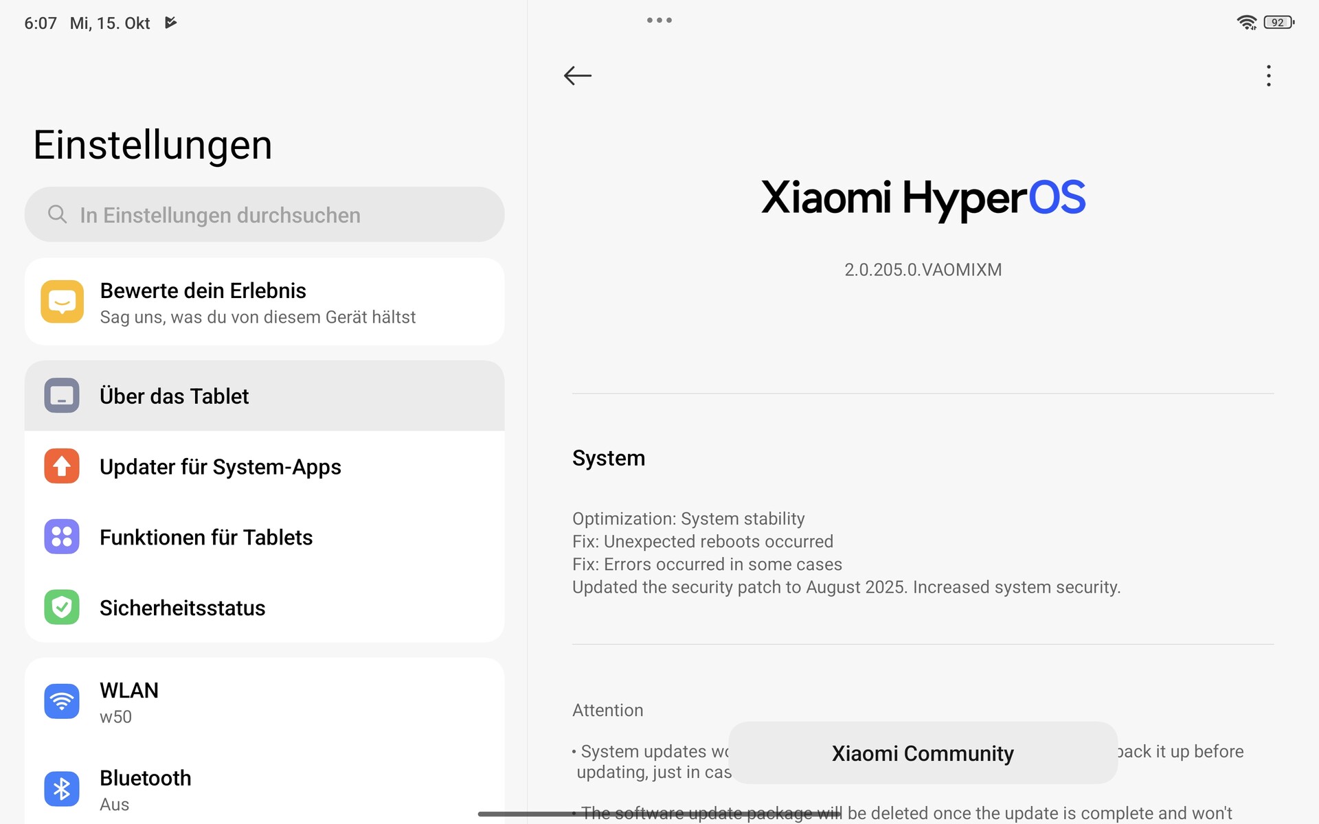 O Xiaomi Pad Mini é executado em Android 15 com a interface de usuário HyperOS 2.0 da Xiaomi. De acordo com o Xiaomi Trust Centero Pad Mini receberá atualizações do sistema operacional até Android 17. Ele também receberá atualizações de segurança por 3 anos, até setembro de 2028. As últimas serão lançadas a cada três meses. No momento do teste, em meados de outubro, o tablet estava executando os patches de segurança Android de agosto, que, portanto, estão atualizados.