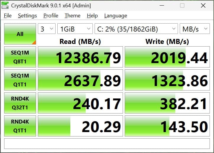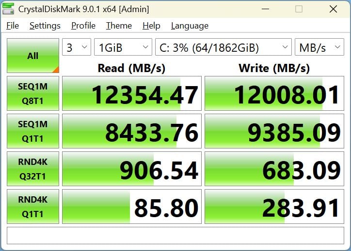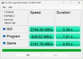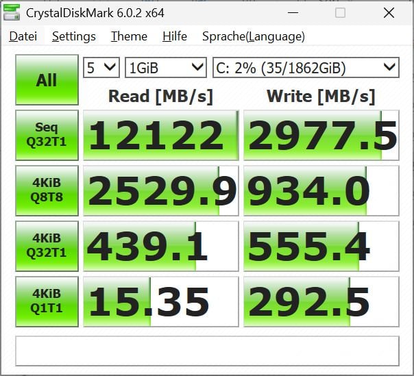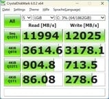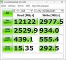Na segunda tentativa, os resultados parecem muito melhores: de acordo com o CrystalDiskMark 6, a unidade atinge quase 12.000 MB/s nas velocidades de leitura e gravação - um resultado impressionante. O CrystalDiskMark 9 mostra números ainda um pouco mais altos, enquanto o AS SSD é um pouco mais contido.