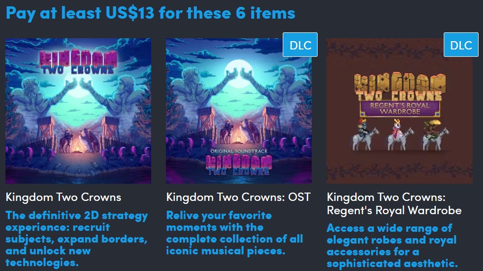 - Kingdom Two Crowns - OST: Esse DLC adiciona uma trilha sonora ao jogo base. O valor é de US$ 9,99.