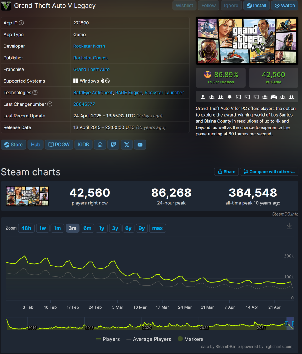 Na maioria dos casos, os proprietários do GTA 5 podem fazer o upgrade para o GTA 5 Enhanced sem nenhum custo. Esse benefício e a curiosidade resultaram em uma contagem máxima de jogadores no Steam de mais de 187.000 em sua estreia em 4 de março. Enquanto isso, o GTA 5 Legacy começou a cair de cerca de 184.000 jogadores diários no início do mês. Embora ambas as versões tenham agora menos participantes, o GTA 5 Legacy tem 86.200 apoiadores, em comparação com os pouco menos de 72.000 da edição aprimorada.